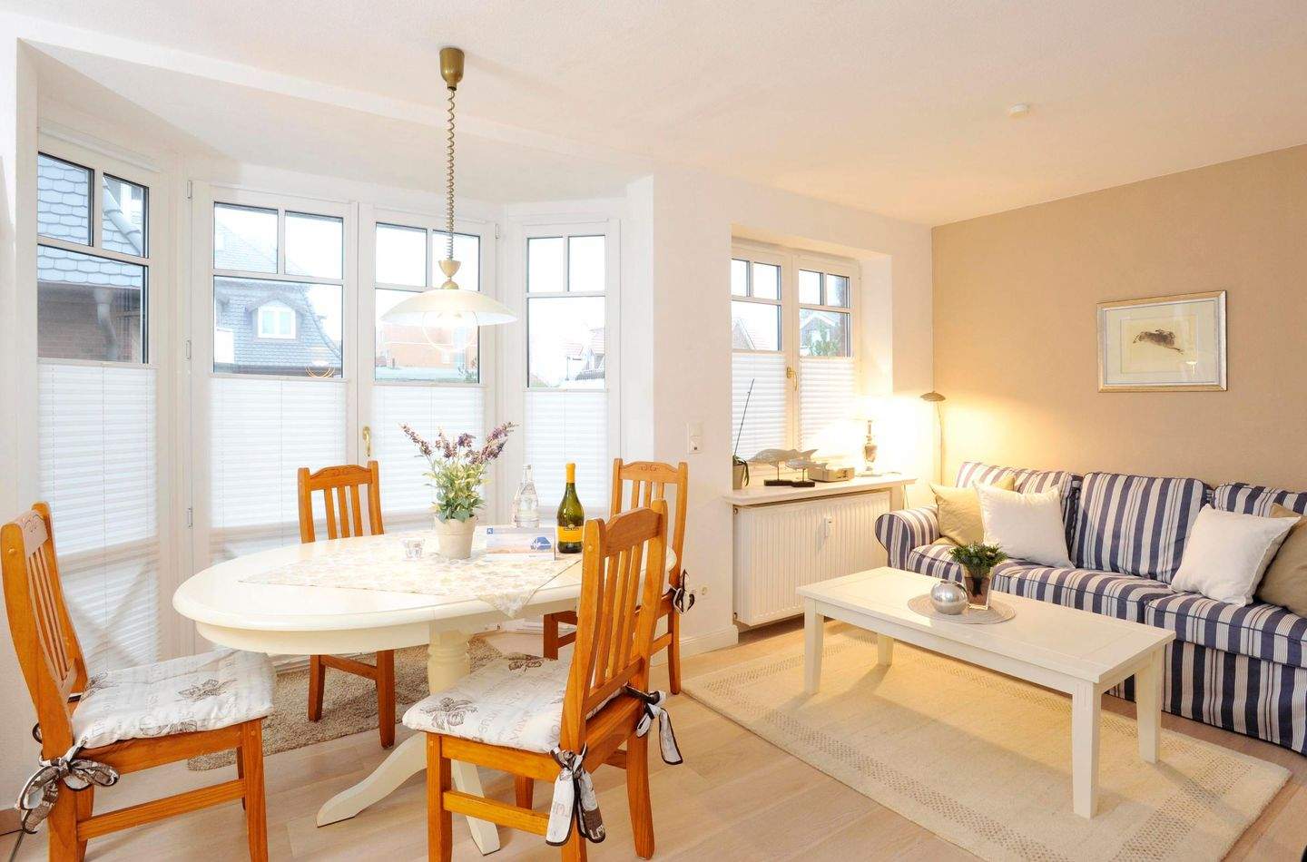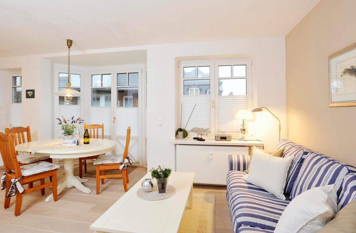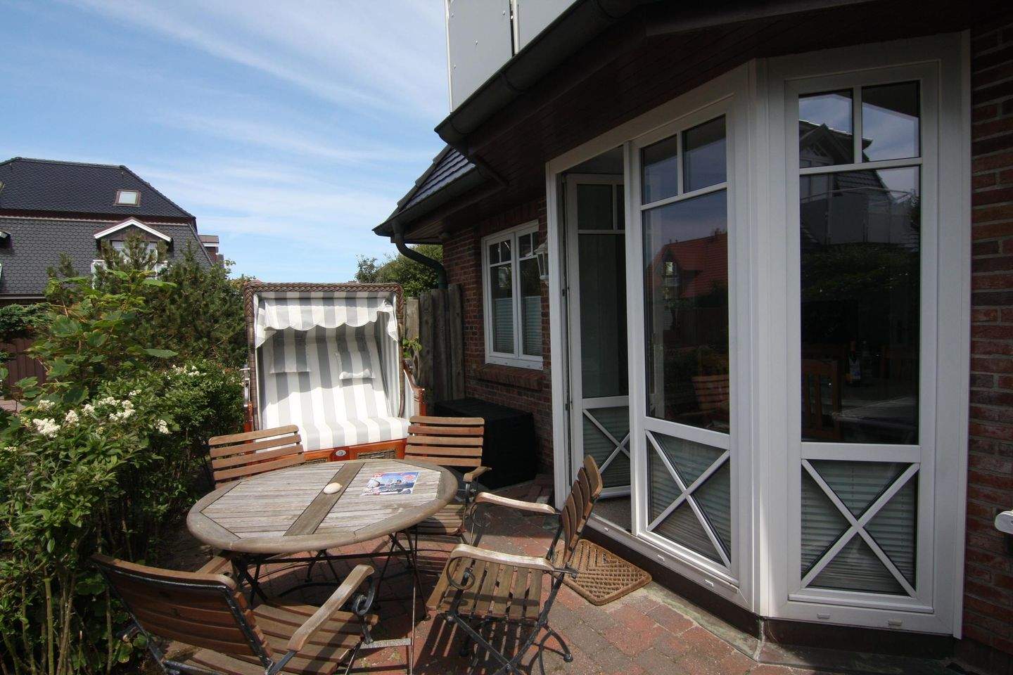 Mit Terrasse nach Westen und Gartenanteil. Sehr beliebt wegen der ruhigen Lage trotz Nähe zum Strand und zur Fußgängerzone in Westerland auf Sylt. Nichtraucherwohnung. Wohnzimmer mit Sofa für 3 Personen, Sessel, TV und Esstisch mit 4 Stühlen. Direkter Zugang zur möblierten Terrasse nach Westen.