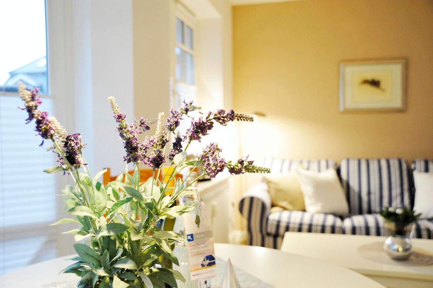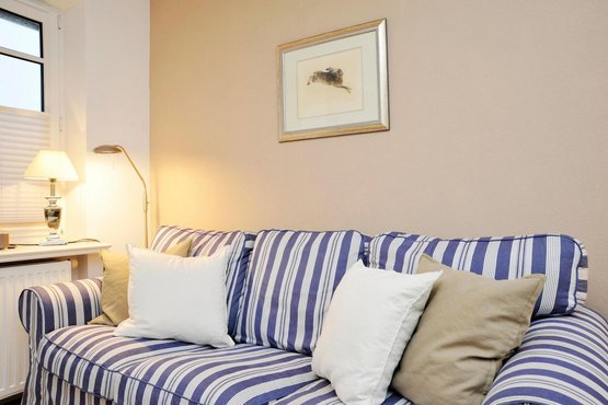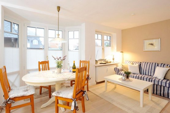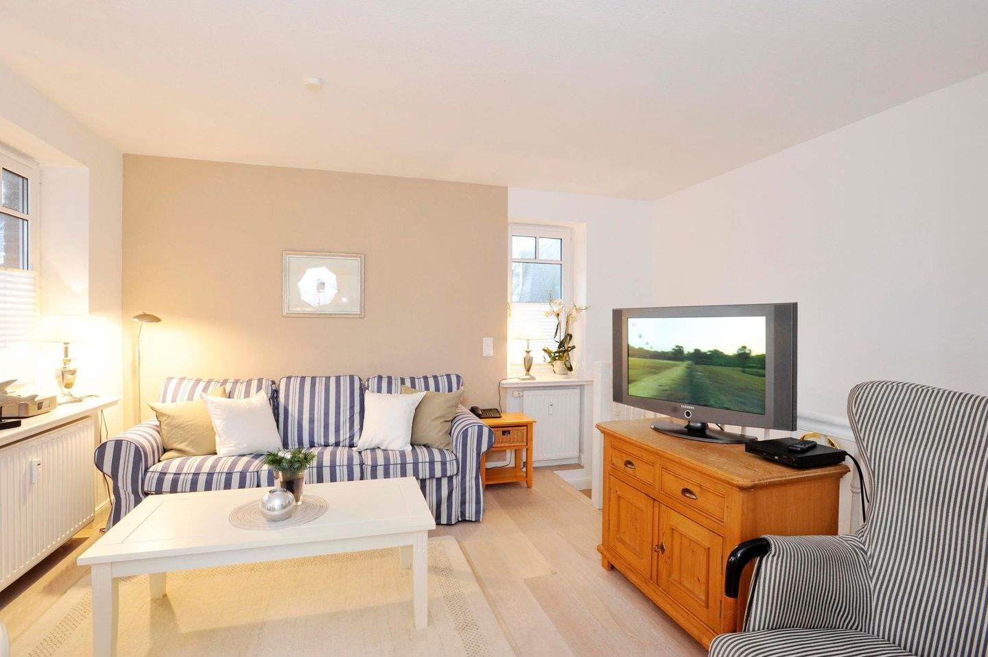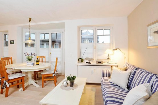 Mit Terrasse nach Westen und Gartenanteil. Sehr beliebt wegen der ruhigen Lage trotz Nähe zum Strand und zur Fußgängerzone in Westerland auf Sylt. Nichtraucherwohnung. Wohnzimmer mit Sofa für 3 Personen, Sessel, TV und Esstisch mit 4 Stühlen. Direkter Zugang zur möblierten Terrasse nach Westen.