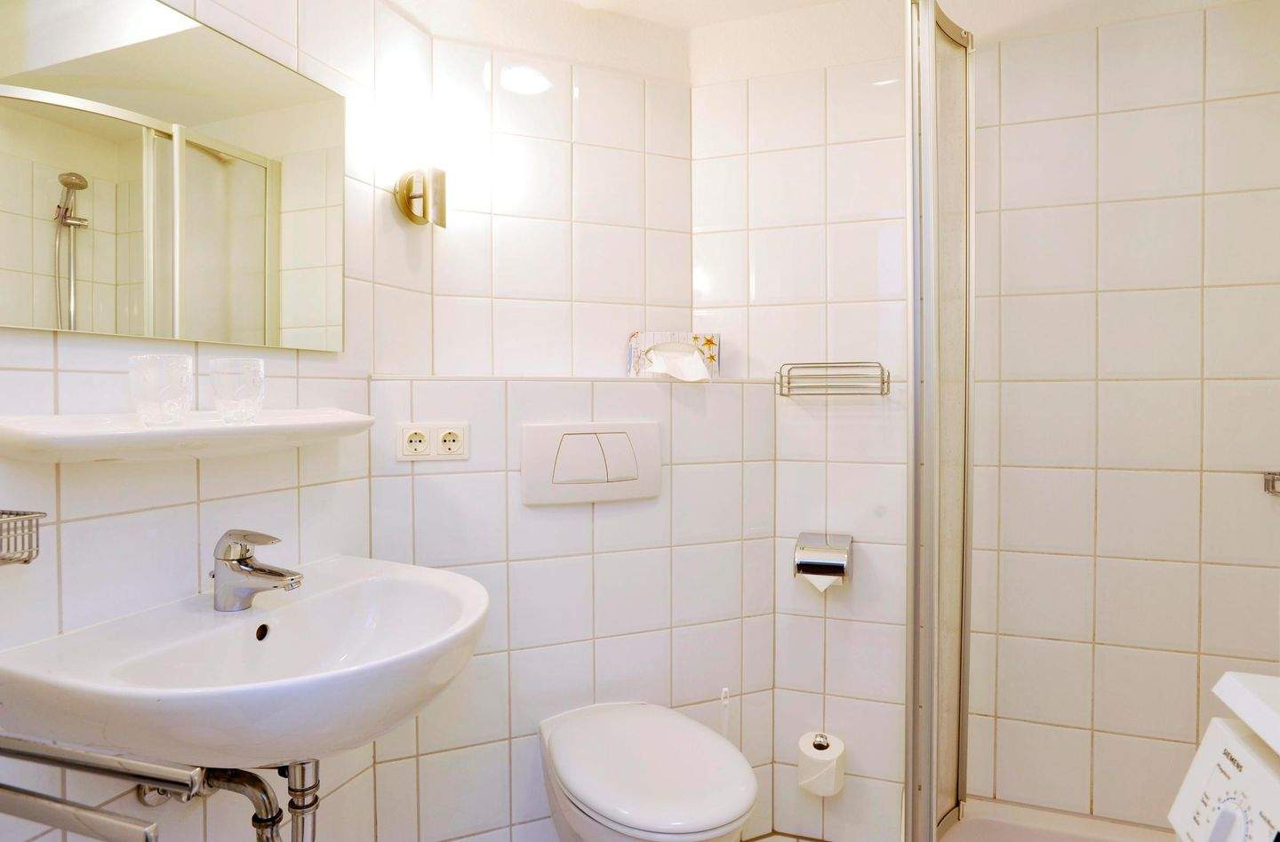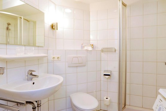Badezimmer (Duschbad) mit Dusche, WC, Handtuchwärmer, Föhn und Waschmaschine.