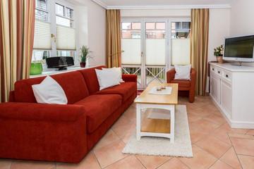 Sehr beliebt wegen der ruhigen Lage trotz Nähe zum Strand und zur Fußgängerzone in Westerland auf Sylt. Nichtraucherwohnung. Hunde willkommen. Wohnzimmer mit Sofa, Sesseln, Esstisch für 6 Personen und TV.
