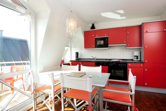 Moderne offene Küche mit 4-flammigem Herd, Geschirrspüler, Philips Senseo-Maschine, Krups Nespresso-Maschine und jedem Komfort.