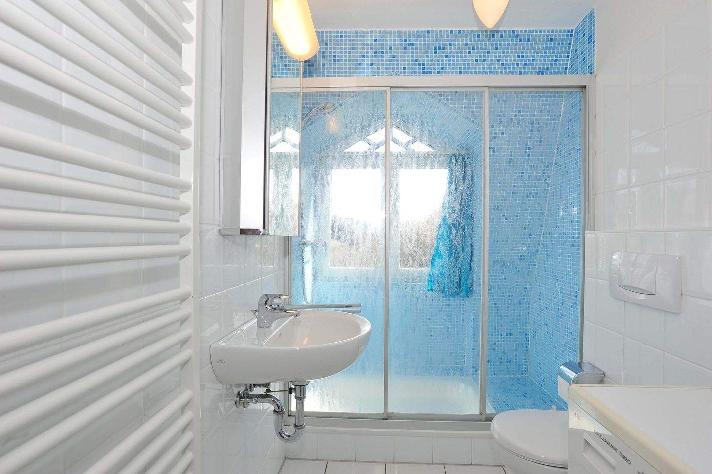 Badezimmer (Duschbad) mit Dusche, WC, Handtuchwärmer, Waschmaschine, Föhn und Tageslicht.