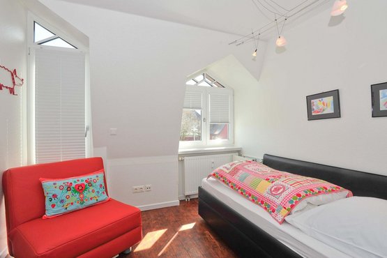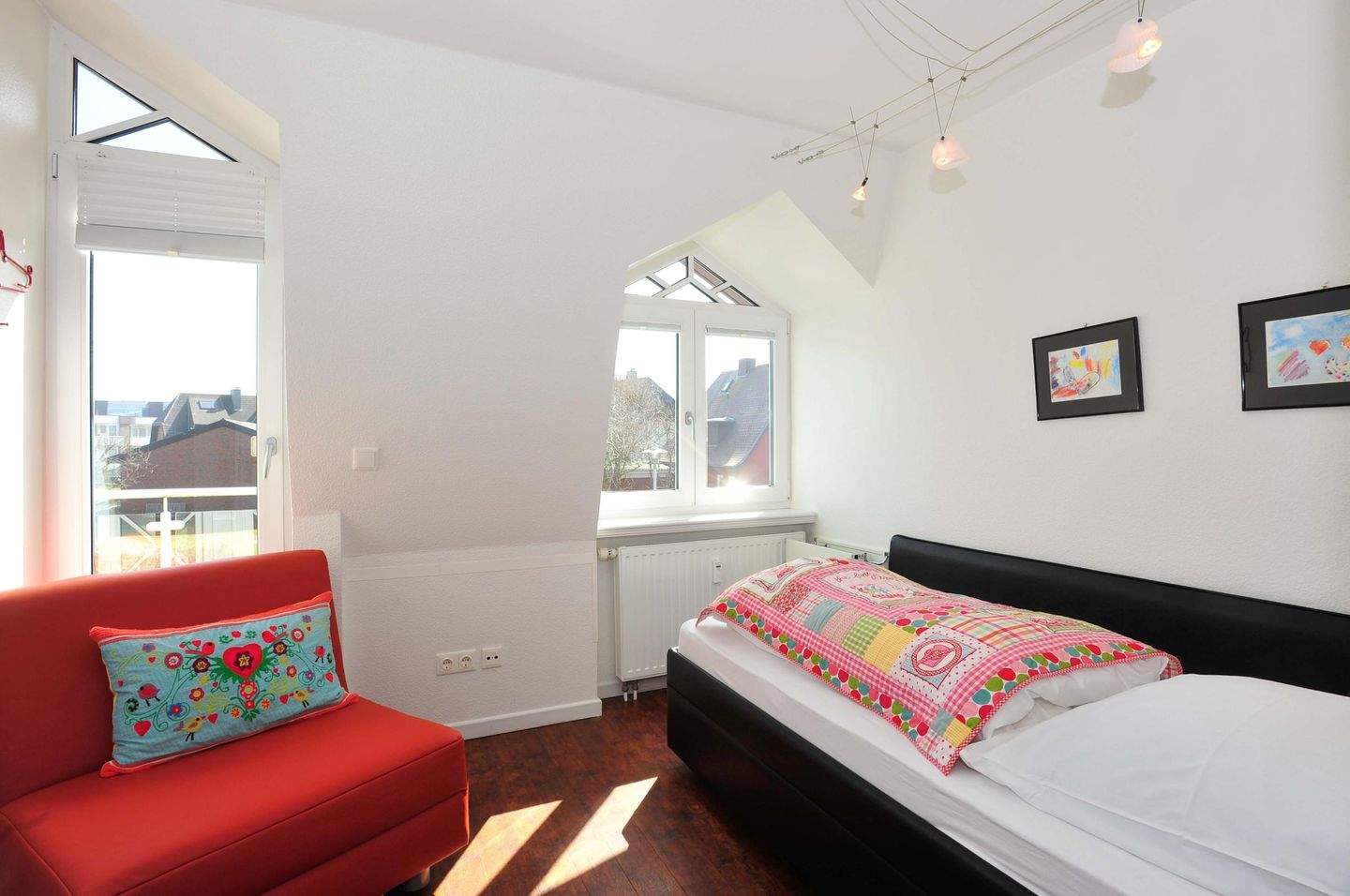 2. Schlafzimmer mit 1 Einzelbett (100x190cm), Sessel und Zugang zum 3. Balkon nach Osten.