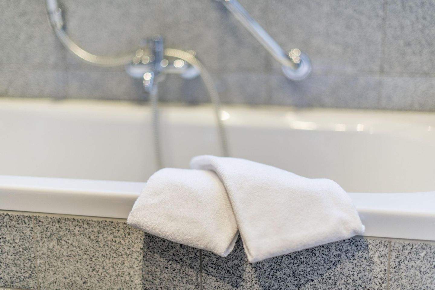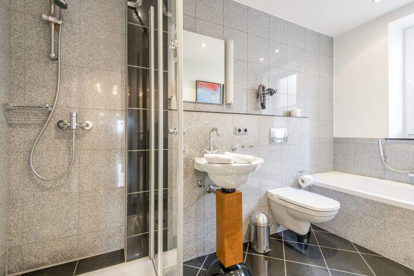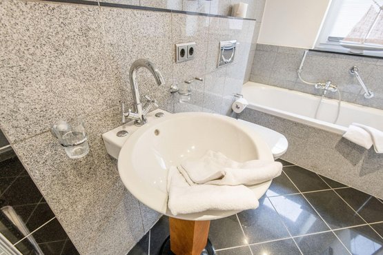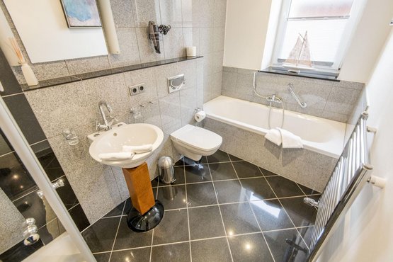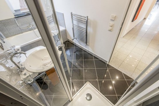 Badezimmer (Vollbad) mit Badewanne, Dusche, WC, Handtuchwärmer, Föhn und Tageslicht.