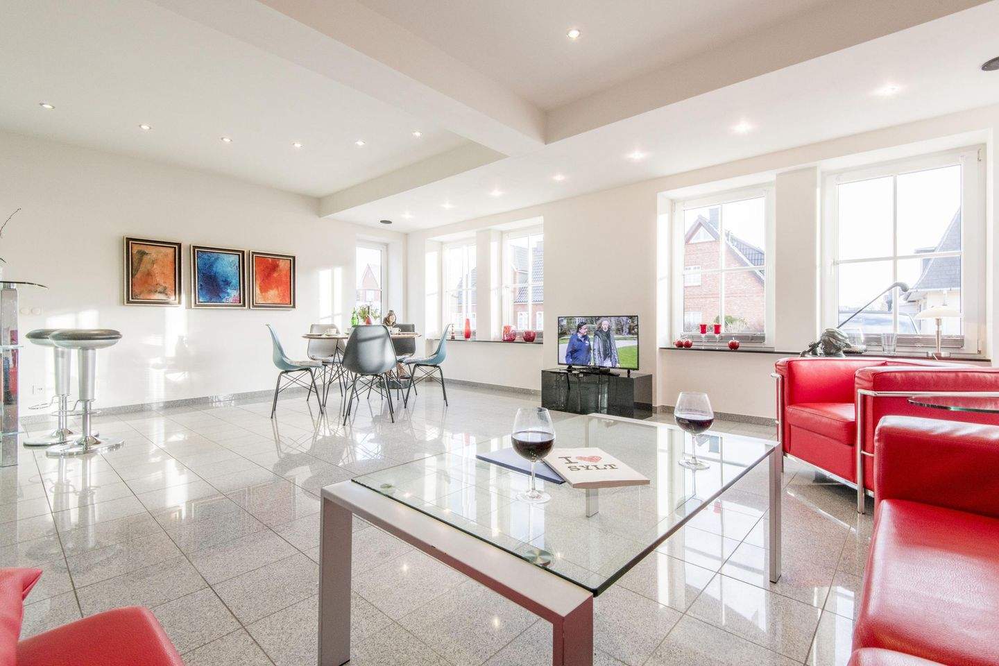 Wohnzimmer mit großzügigem Sofa, Sessel, Esstisch für 6 Personen und TV.