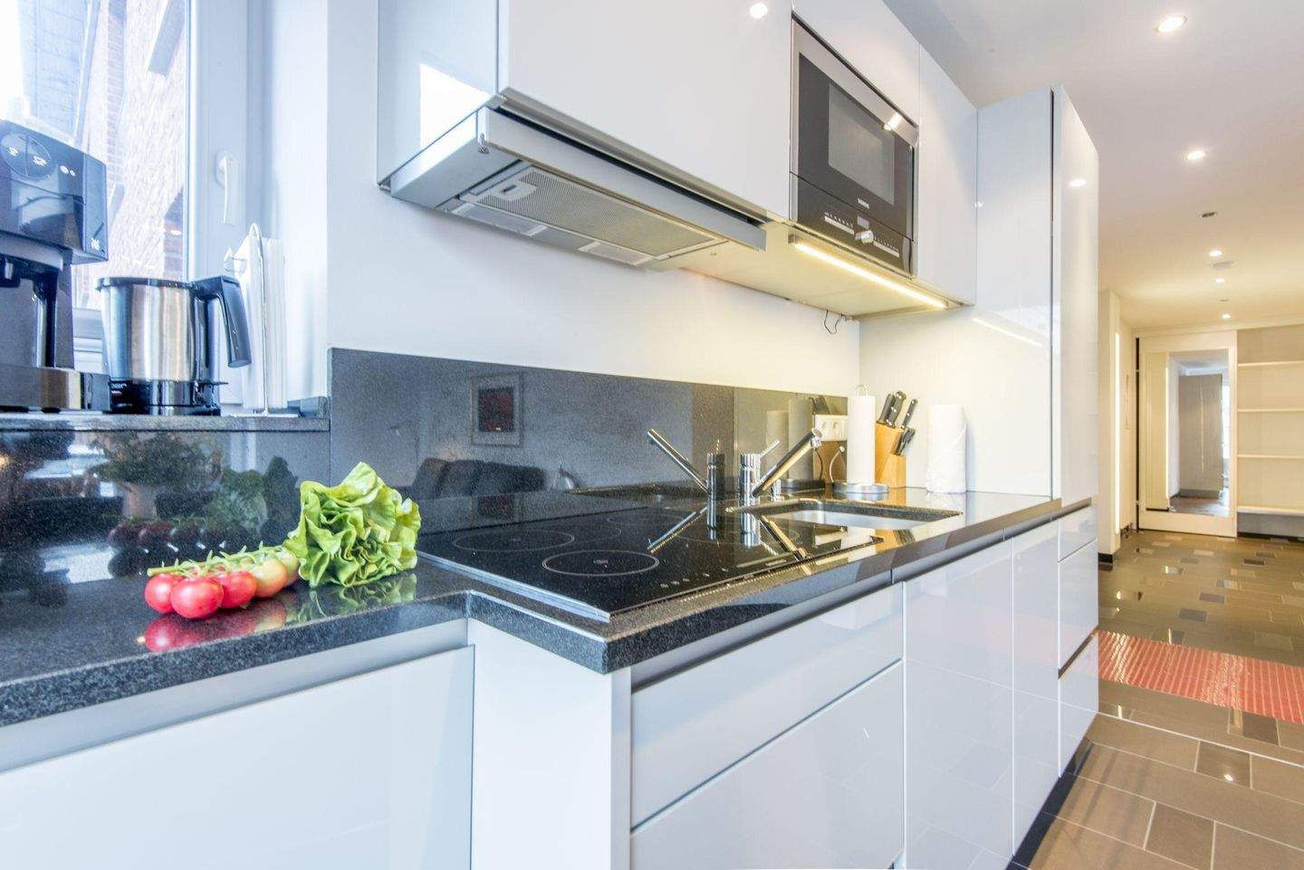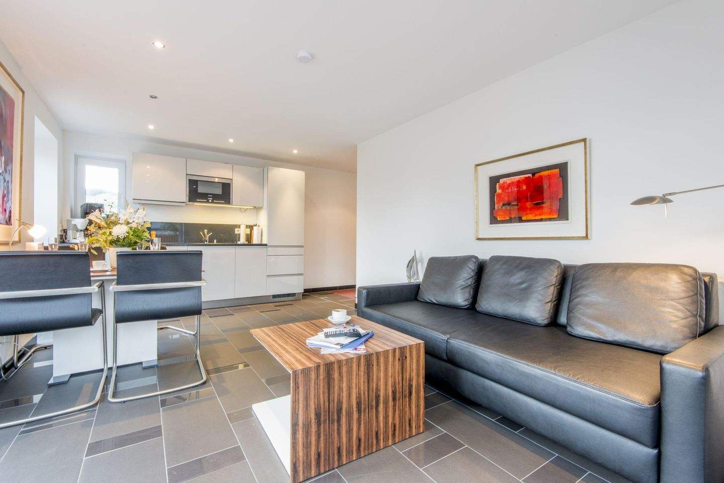 Offene Küche mit Induktionsherd, Geschirrspüler, Filterkaffeemaschine und viel Komfort. Esstisch für bis zu 4 Personen.