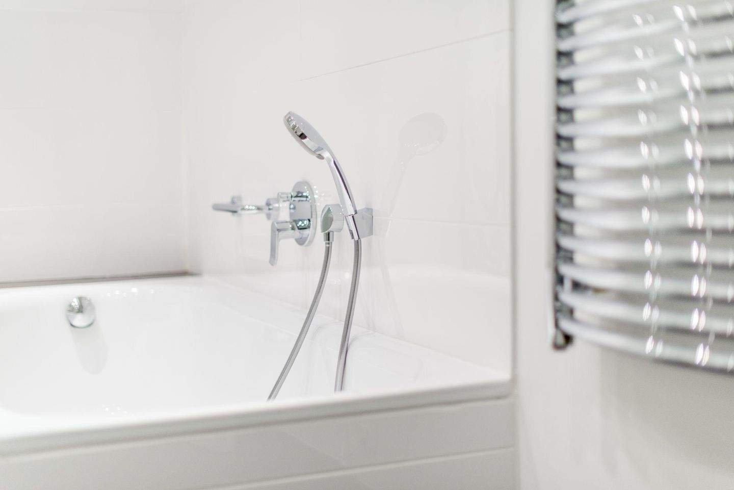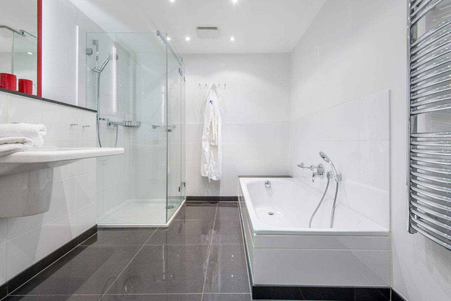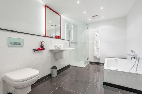 Großes Badezimmer (Vollbad) mit Badewanne, separater Dusche, WC, Föhn und Handtuchwärmer.
