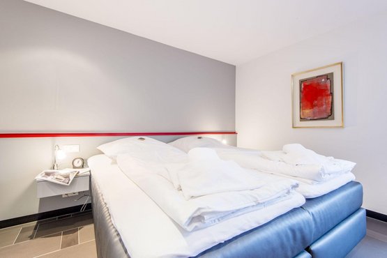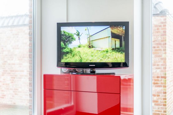 Schlafzimmer mit Doppelbett (2x 90x200cm), TV und Einbauschrank. Austritt zum Garten.