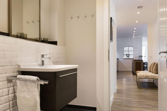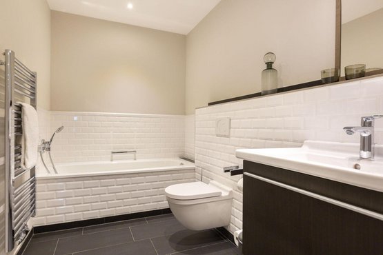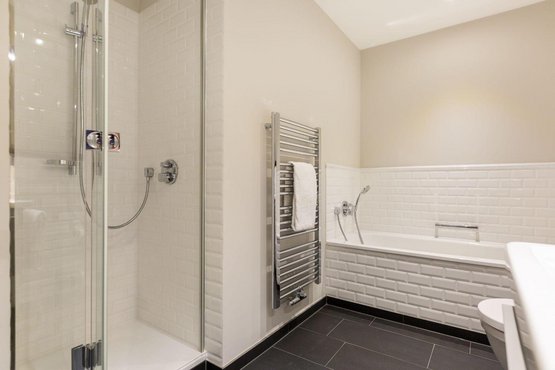 Badezimmer (Vollbad) mit Badewanne, Dusche, WC, Föhn und Handtuchwärmer. Separates Gäste-WC.