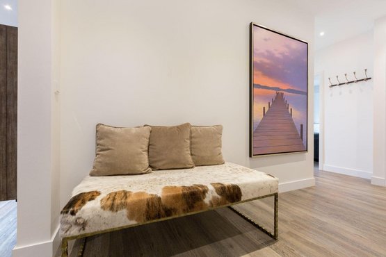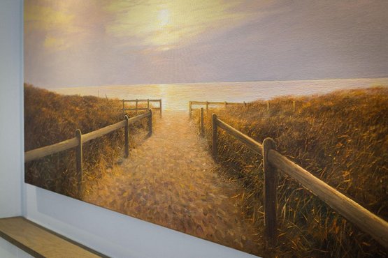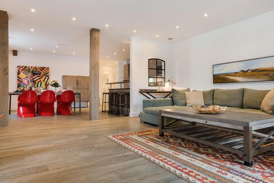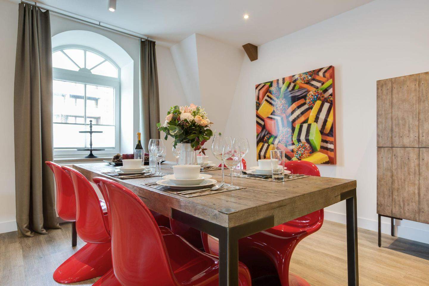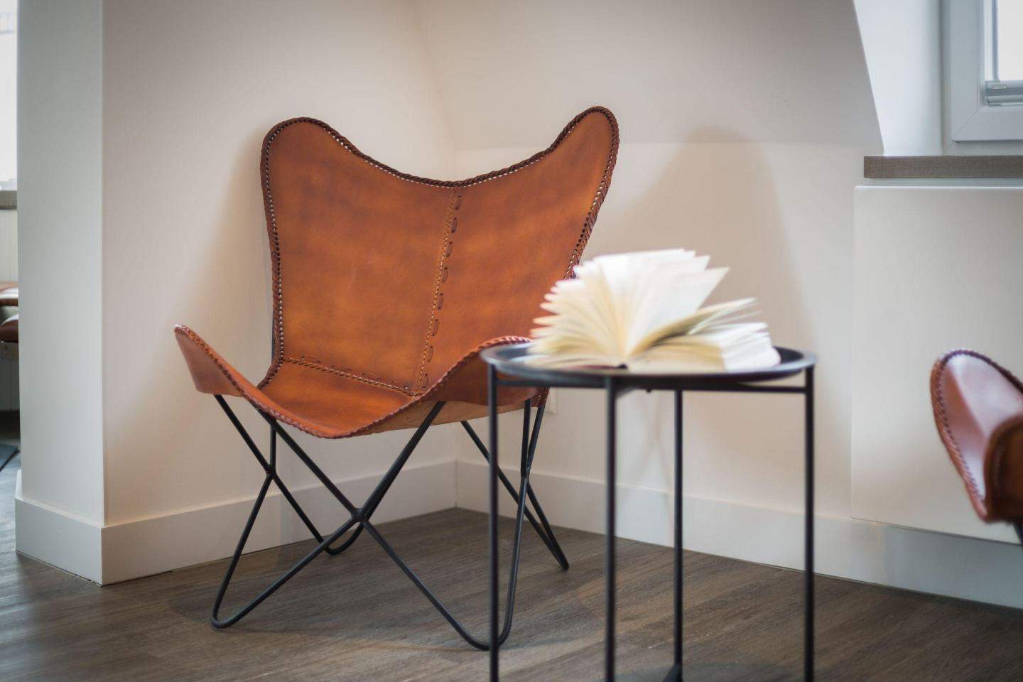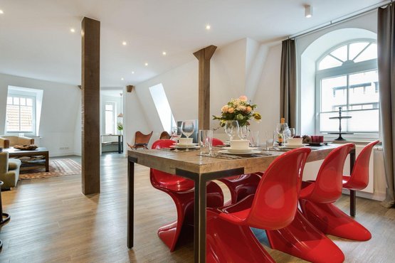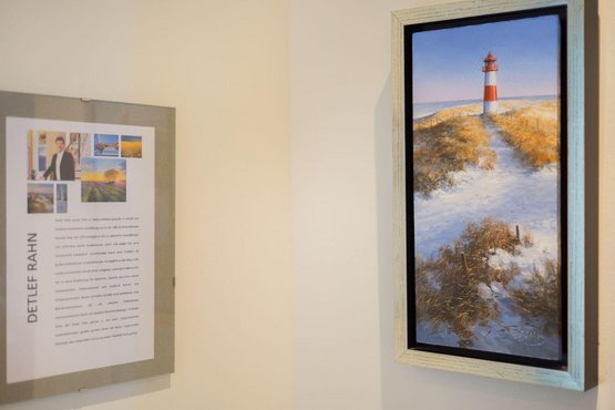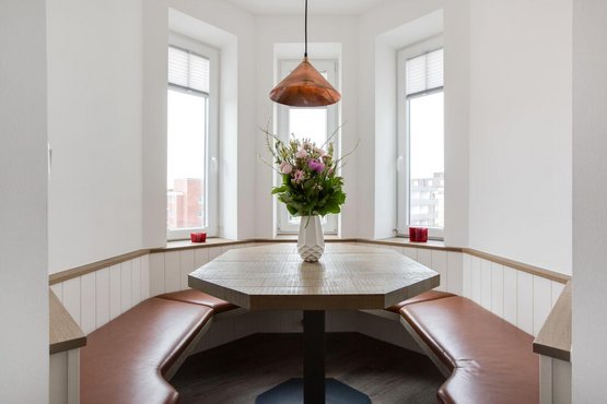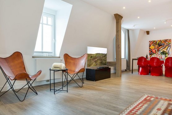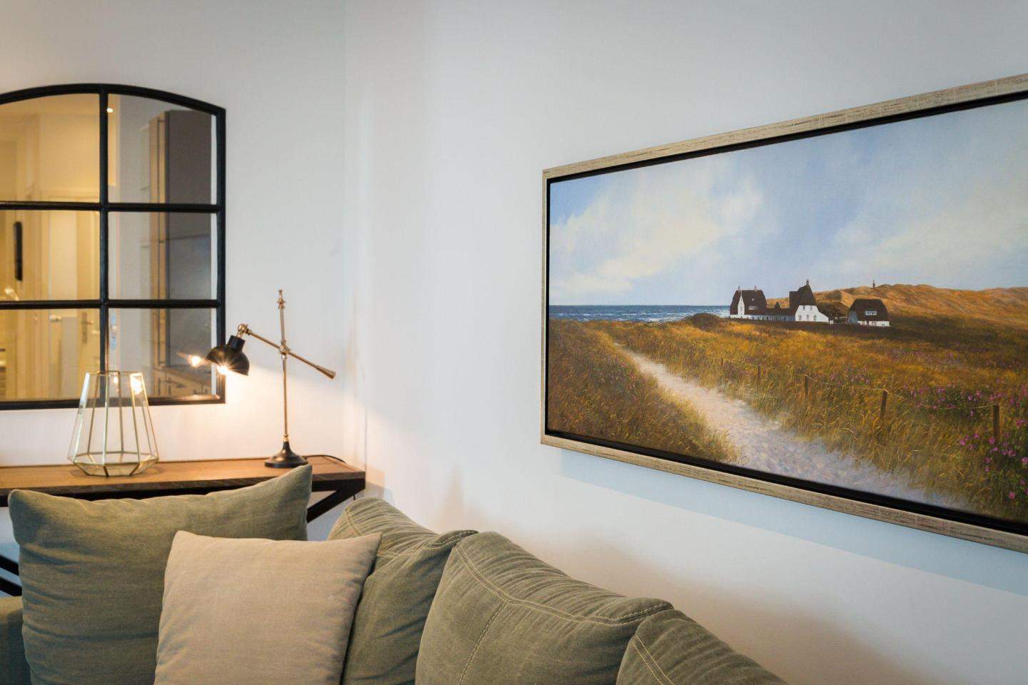 Moderner Umbau des traditionsreichen Hotels 'Seeburg' an der Kurpromenade von Westerland im Zeichen der Kunst. In Zusammenarbeit mit der Kunstgalerie Mensing wurde jede der elf Wohnungen einem Künstler gewidmet. Jeder Raum ist individuell und liebevoll in einem aktuellen Retro-Look gestaltet. Das exklusive Mobiliar aus Frankreich, Belgien und England bietet eine einladende Wohlfühlatmosphäre der Extra-Klasse. Mit Wellnessbereich und Sauna im Haus. Zum Strandübergang sind es nur 150 Meter. Nichtraucher. Wohnzimmer mit phantastischem Blick auf die Flaniermeile Friedrichstraße und das Meer, mit Ecksofa, Sesseln und TV. Essecke mit uriger Sitzbank und herrlichem Rundum-Ausblick im Turm des Hauses.