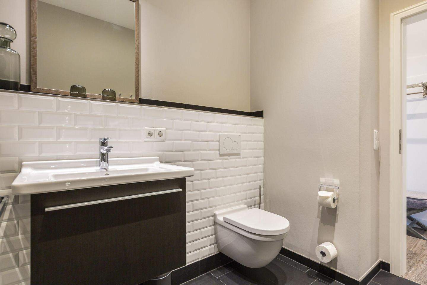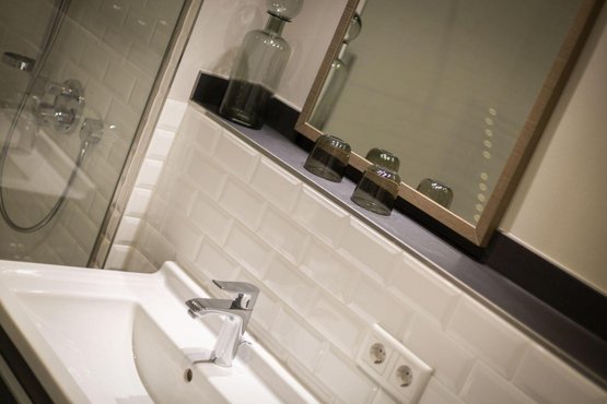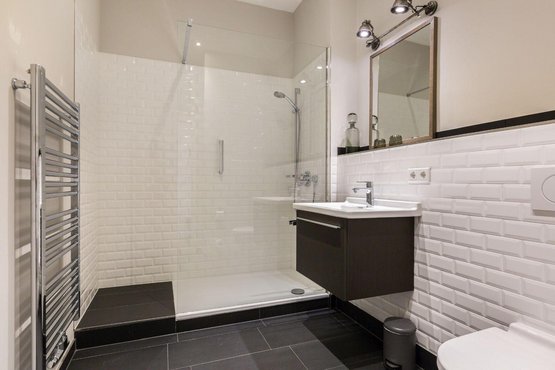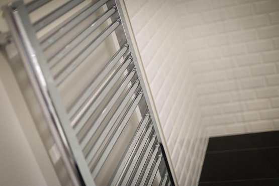 Badezimmer (Duschbad) mit Dusche, WC, Föhn und Handtuchwärmer.