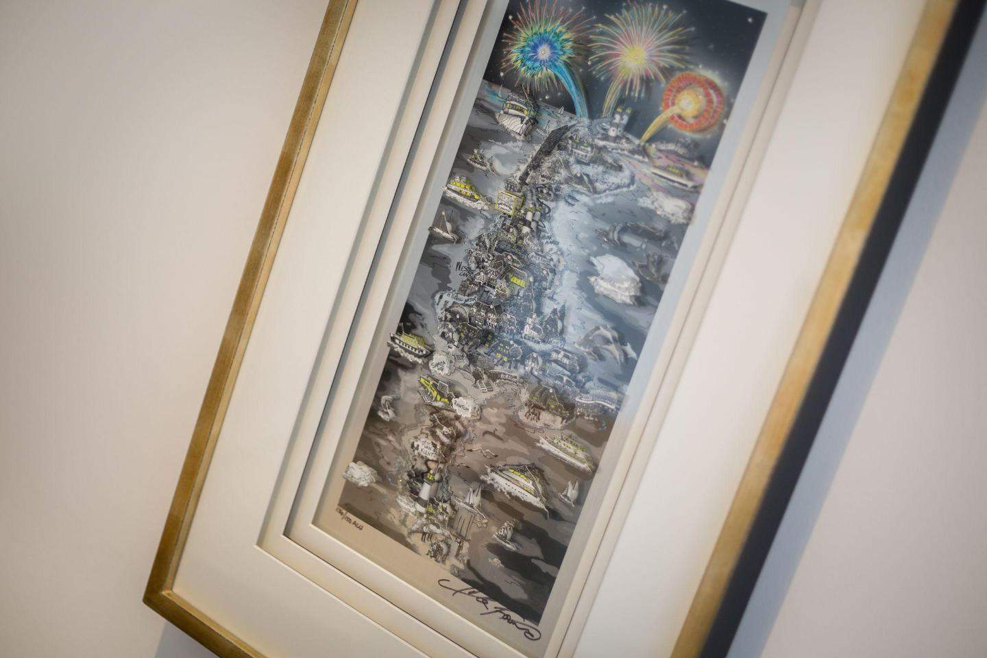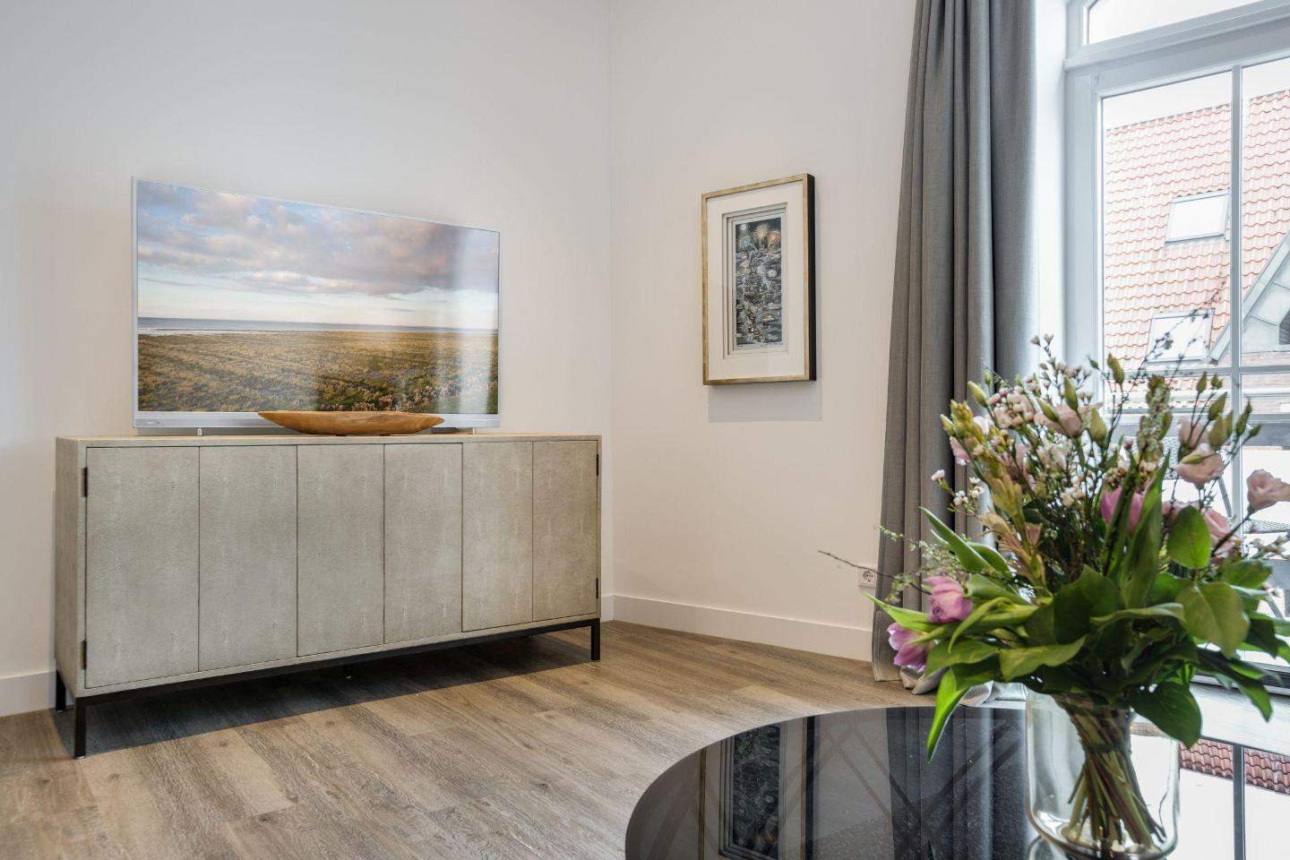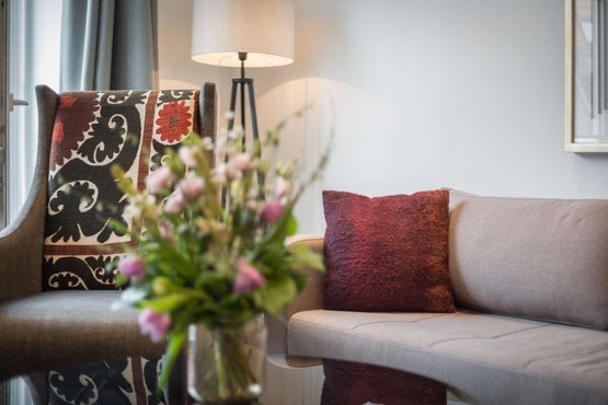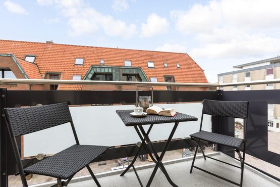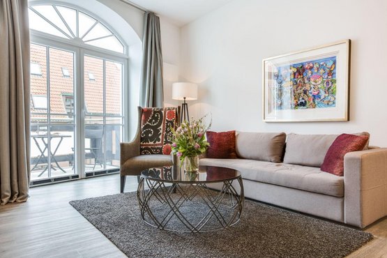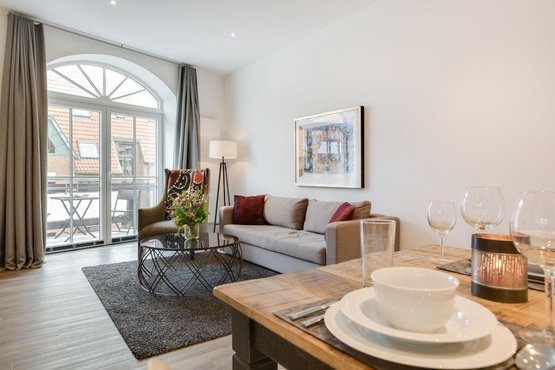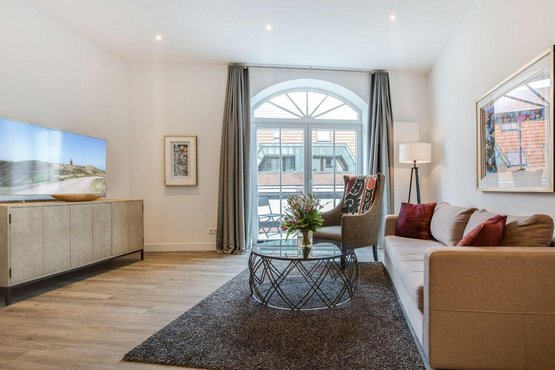 Exklusive 2-Zimmer-Ferienwohnung 'Charles' mit ca. 53 m² auf 1 Ebene (2. OG, mit Fahrstuhl) in sehr zentraler und sehr strandnaher Lage in Westerland auf Sylt. Mit Meerblick vom Balkon. Moderner Umbau des traditionsreichen Hotels 'Seeburg' an der Kurpromenade von Westerland im Zeichen der Kunst. In Zusammenarbeit mit der Kunstgalerie Mensing wurde jede der elf Wohnungen einem Künstler gewidmet. Jeder Raum ist individuell und liebevoll in einem aktuellen Retro-Look gestaltet. Das exklusive Mobiliar aus Frankreich, Belgien und England bietet eine einladende Wohlfühlatmosphäre der Extra-Klasse. Mit Wellnessbereich und Sauna im Haus. Zum Strandübergang sind es nur 150 Meter. Nichtraucher. Wohnzimmer mit Sofa, Sessel und TV. Direkter Zugang zum Balkon nach Süden, von dem aus Sie einen kleinen Meerblick haben.