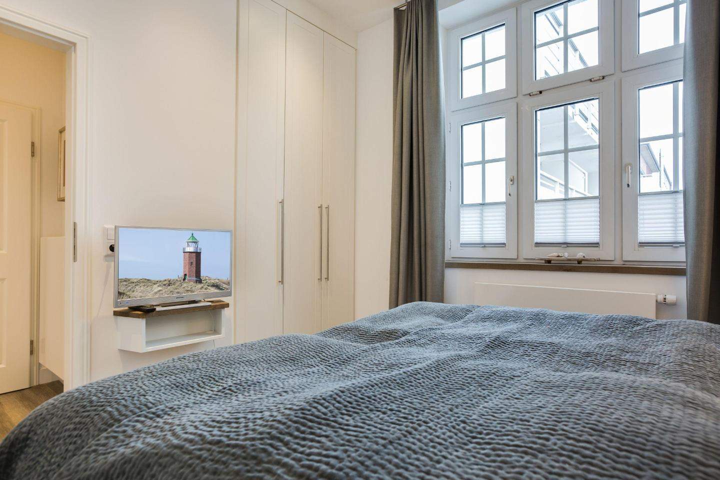 Schlafzimmer mit Doppelbett (2x 90x200cm), Einbauschrank und TV.