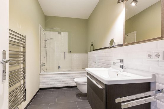 Badezimmer (Vollbad) mit Badewanne, Dusche, WC, Föhn und Handtuchwärmer.