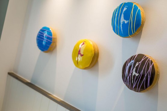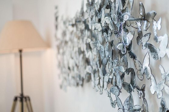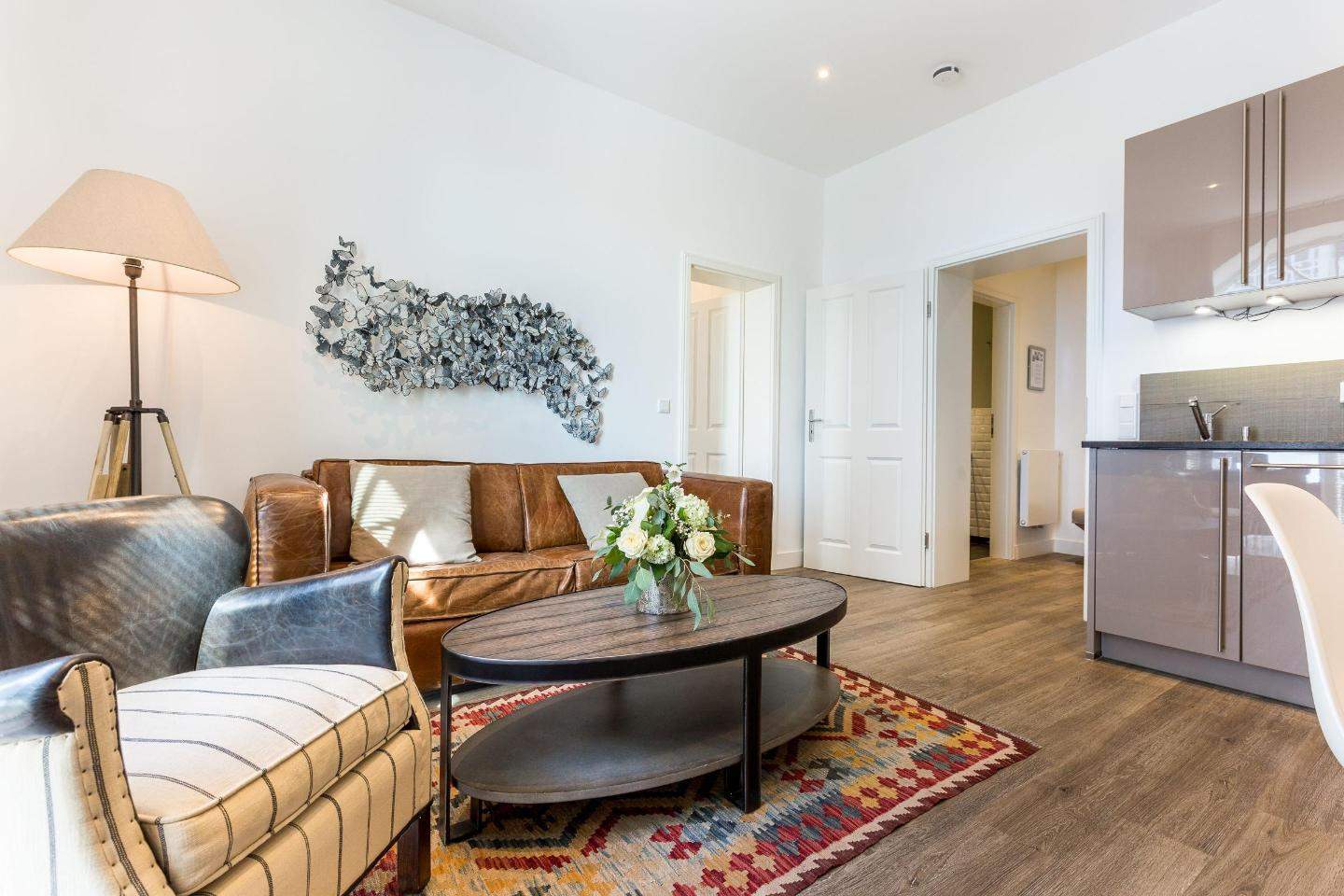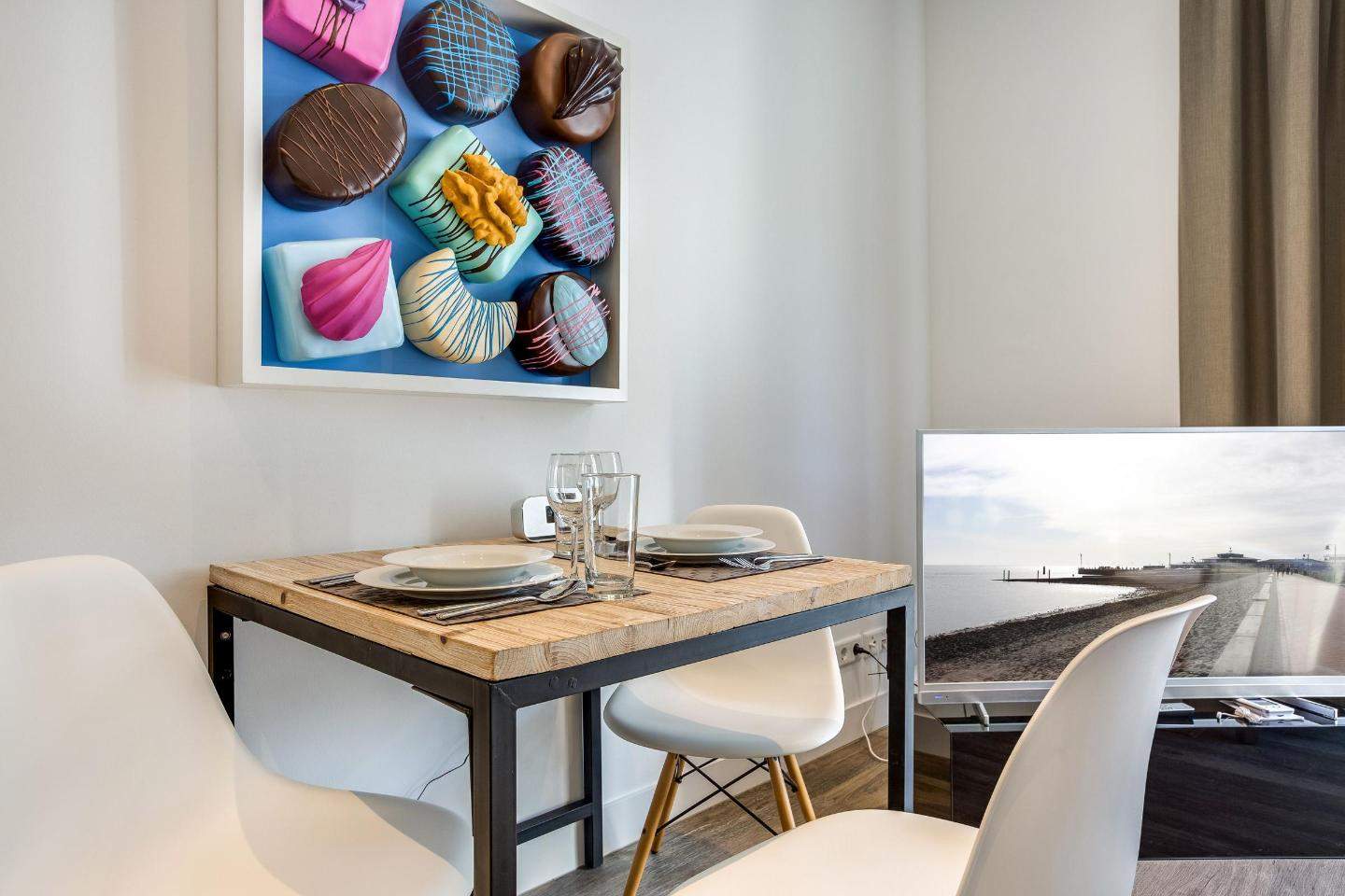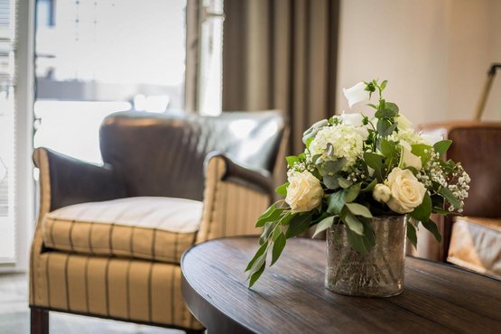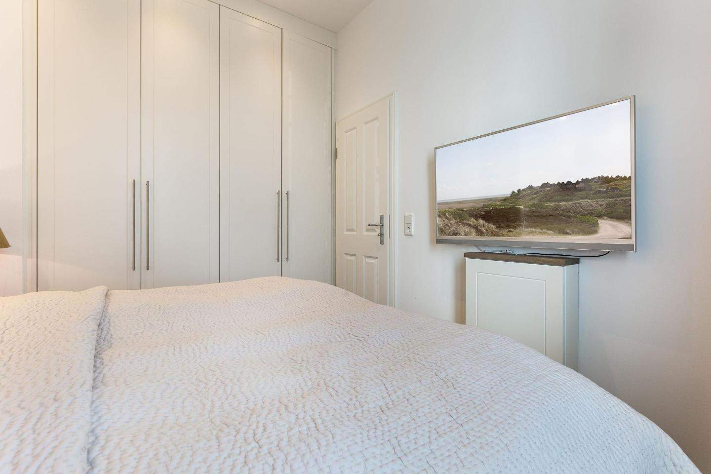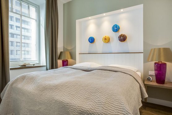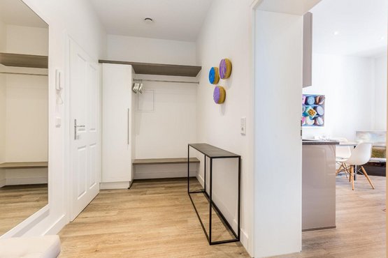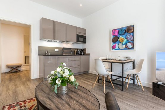 Exklusive 2-Zimmer-Ferienwohnung 'Tom' mit ca. 41 m² auf 1 Ebene (2. OG, mit Fahrstuhl) in sehr zentraler und sehr strandnaher Lage in Westerland auf Sylt. Moderner Umbau des traditionsreichen Hotels 'Seeburg' an der Kurpromenade von Westerland im Zeichen der Kunst. In Zusammenarbeit mit der Kunstgalerie Mensing wurde jede der elf Wohnungen einem Künstler gewidmet. Jeder Raum ist individuell und liebevoll in einem aktuellen Retro-Look gestaltet. Das exklusive Mobiliar aus Frankreich, Belgien und England bietet eine einladende Wohlfühlatmosphäre der Extra-Klasse. Mit Wellnessbereich und Sauna im Haus. Zum Strandübergang sind es nur 150 Meter. Nichtraucher. Wohnzimmer mit Sofa, Sessel und TV. Direkter Zugang zum Balkon nach Westen.