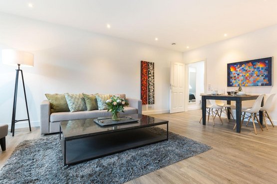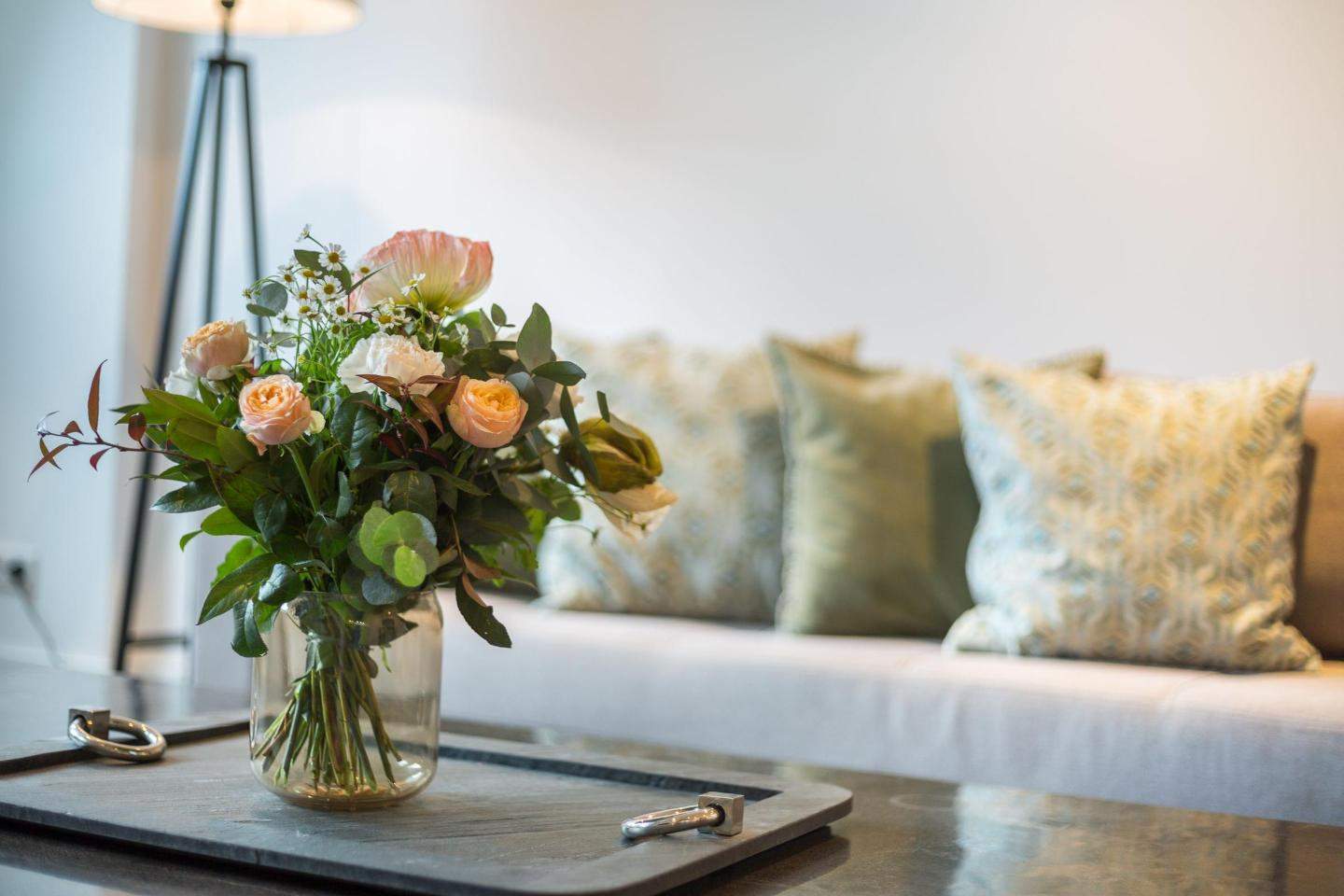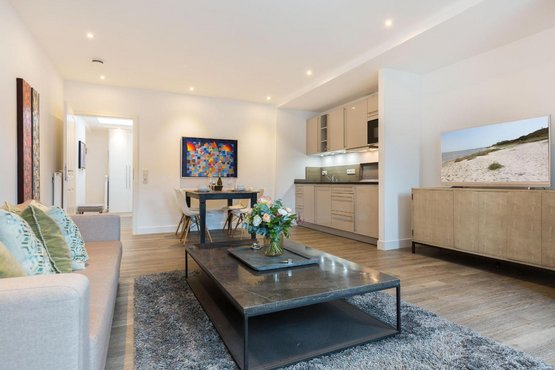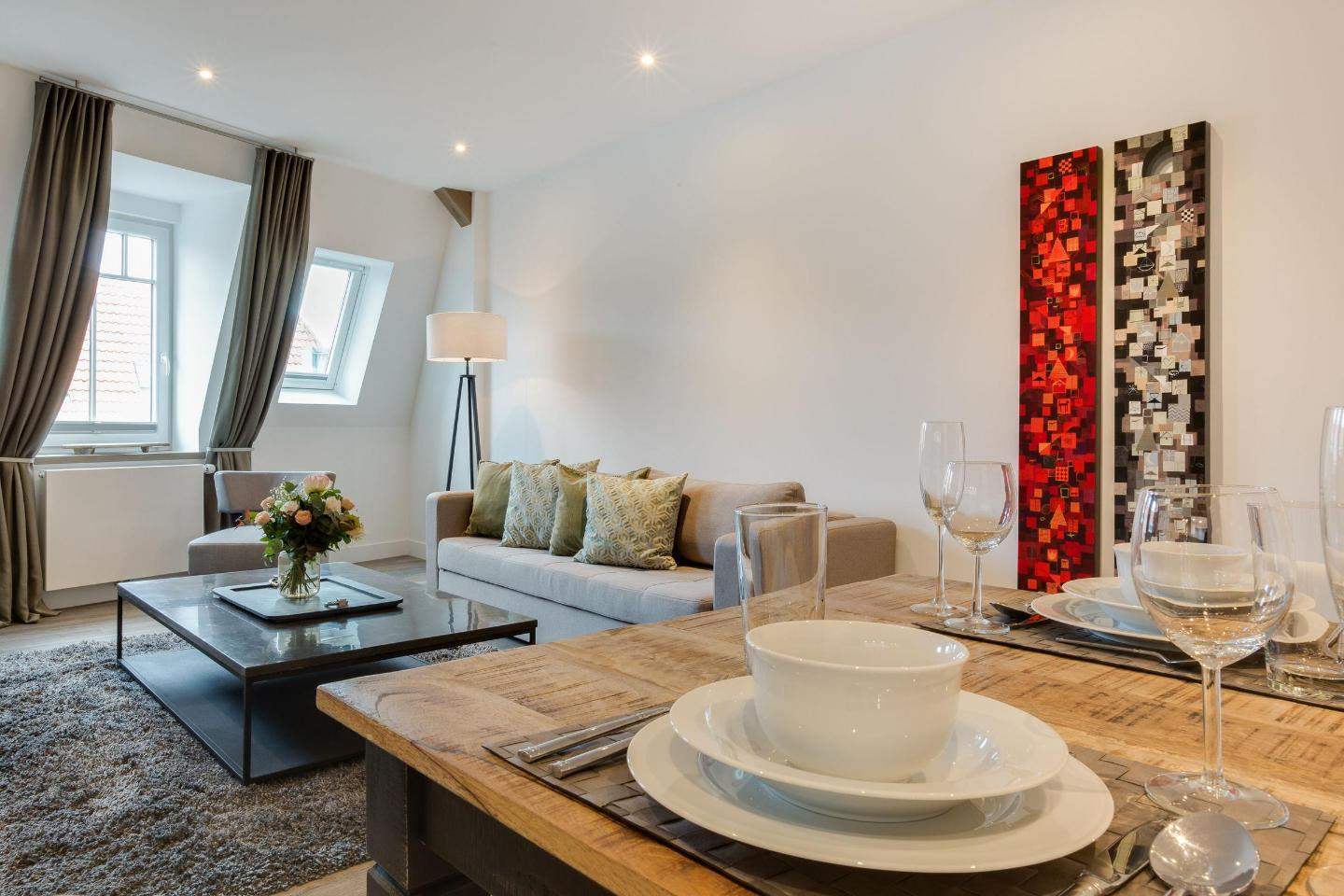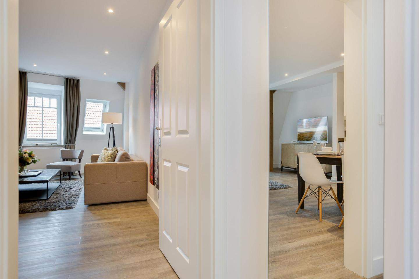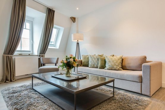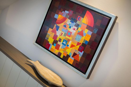 Exklusive 2-Zimmer-Ferienwohnung 'Iliya' mit ca. 49 m² auf 1 Ebene (3. OG, mit Fahrstuhl) in sehr zentraler und sehr strandnaher Lage in Westerland auf Sylt. Moderner Umbau des traditionsreichen Hotels 'Seeburg' an der Kurpromenade von Westerland im Zeichen der Kunst. In Zusammenarbeit mit der Kunstgalerie Mensing wurde jede der elf Wohnungen einem Künstler gewidmet. Jeder Raum ist individuell und liebevoll in einem aktuellen Retro-Look gestaltet. Das exklusive Mobiliar aus Frankreich, Belgien und England bietet eine einladende Wohlfühlatmosphäre der Extra-Klasse. Mit Wellnessbereich und Sauna im Haus. Zum Strandübergang sind es nur 150 Meter. Nichtraucher. Wohnzimmer mit Sofa, Sessel und TV.