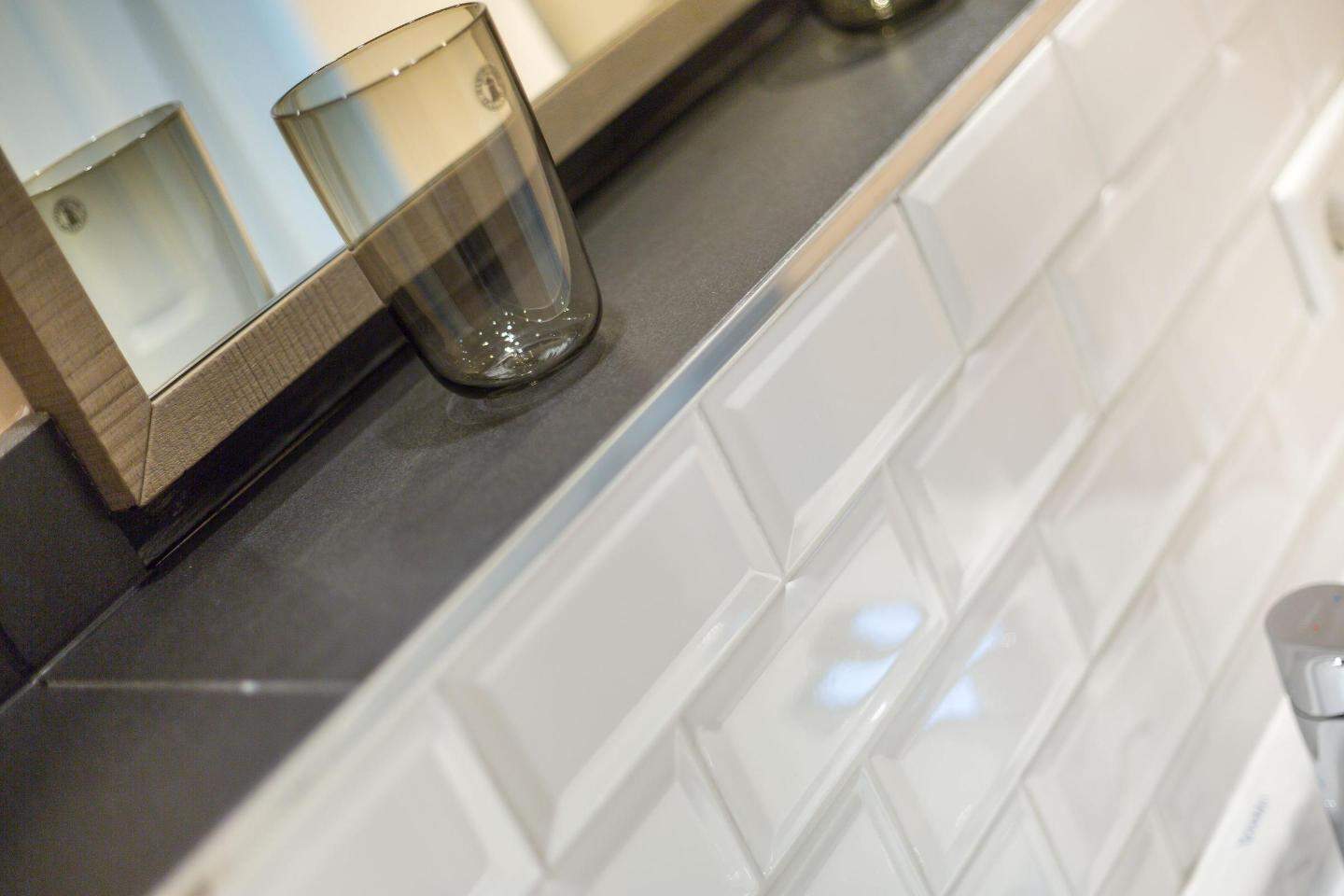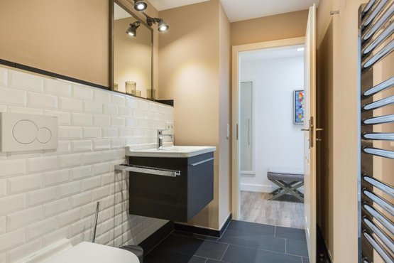 Badezimmer (Duschbad) mit Dusche, WC, Föhn und Handtuchwärmer.