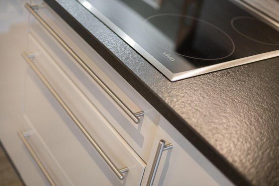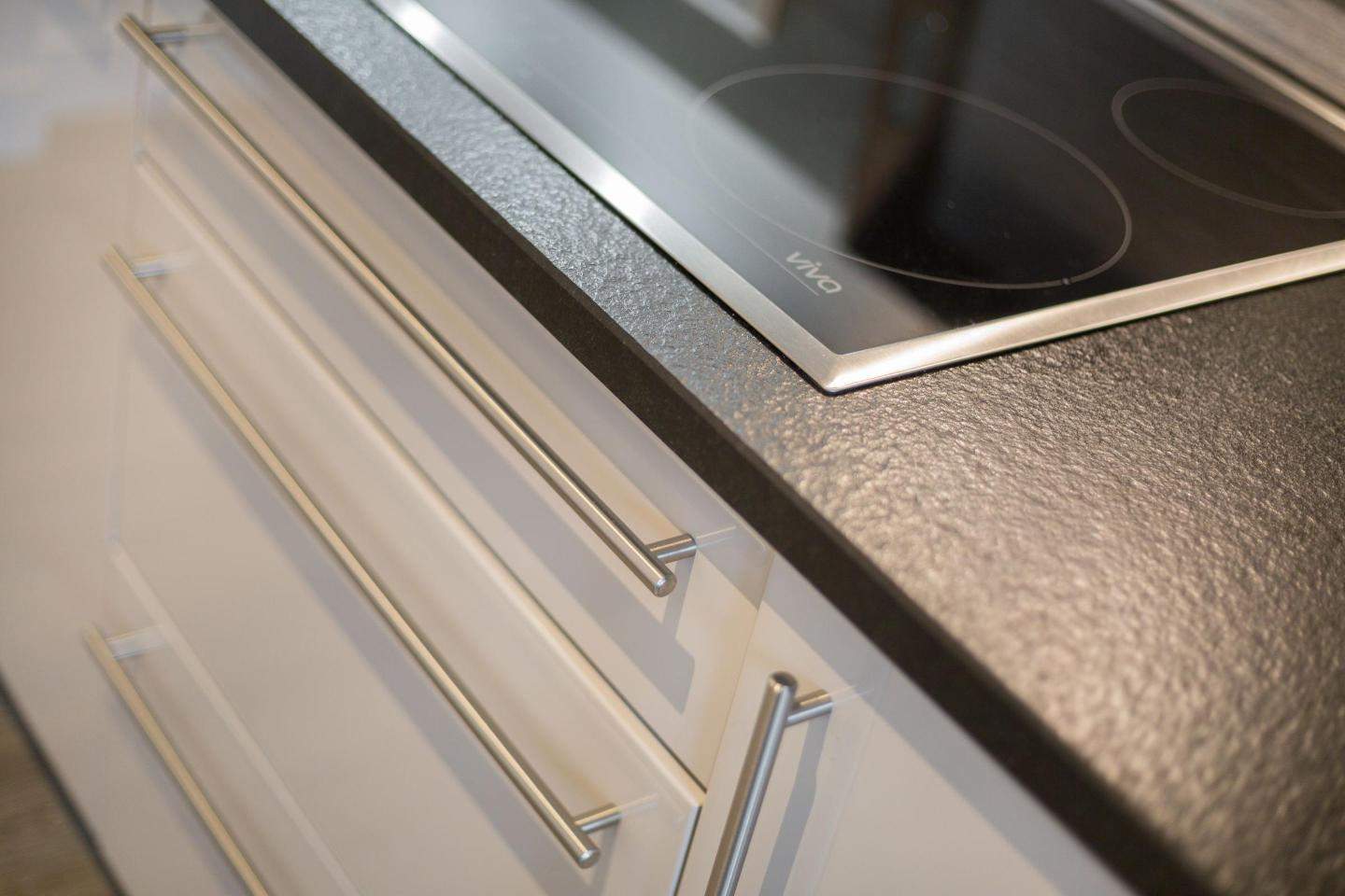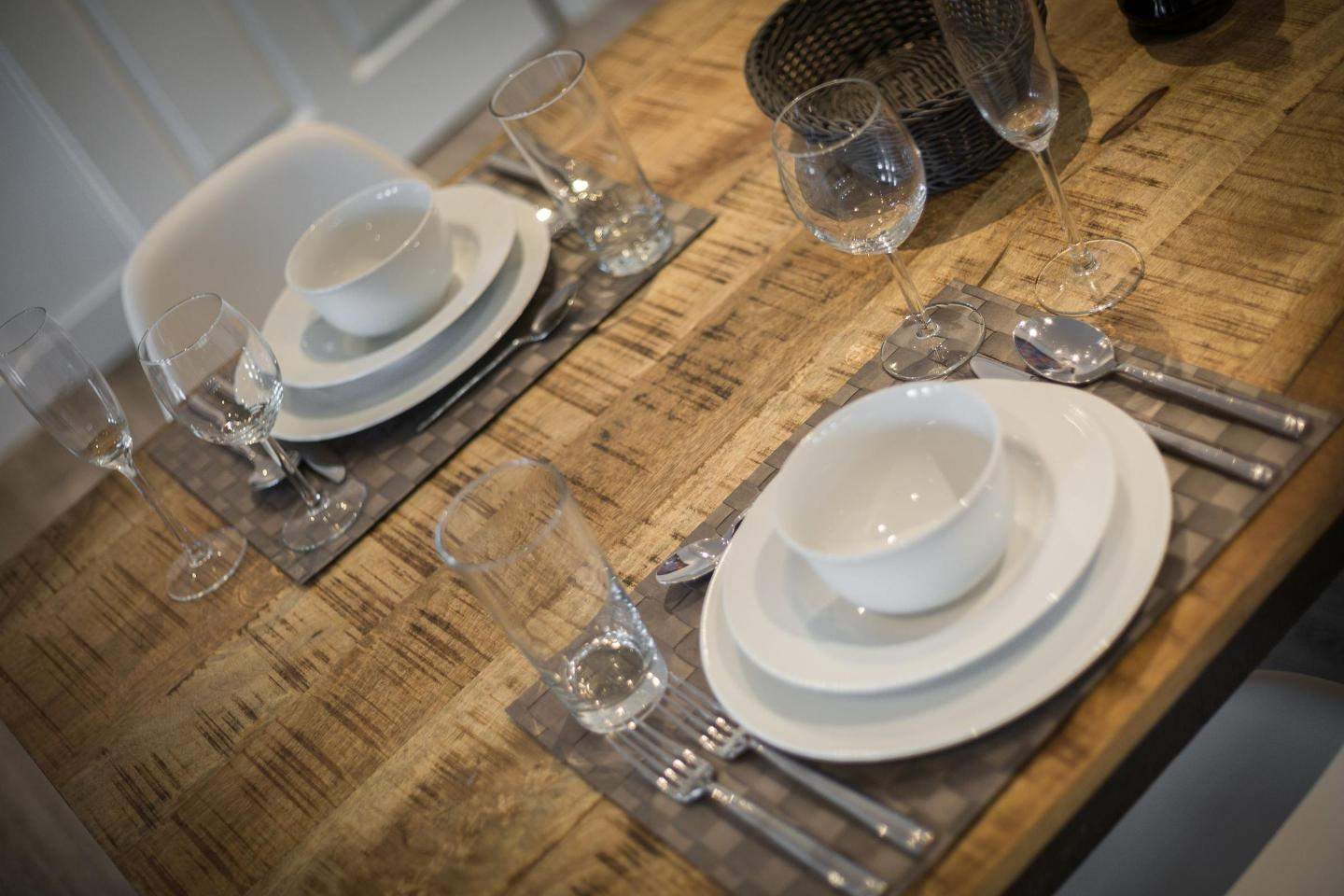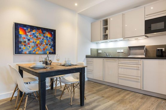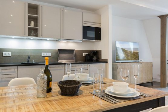 Offene Küche mit Filterkaffeemaschine und allem modernen Komfort. Esstisch mit 4 Stühlen.