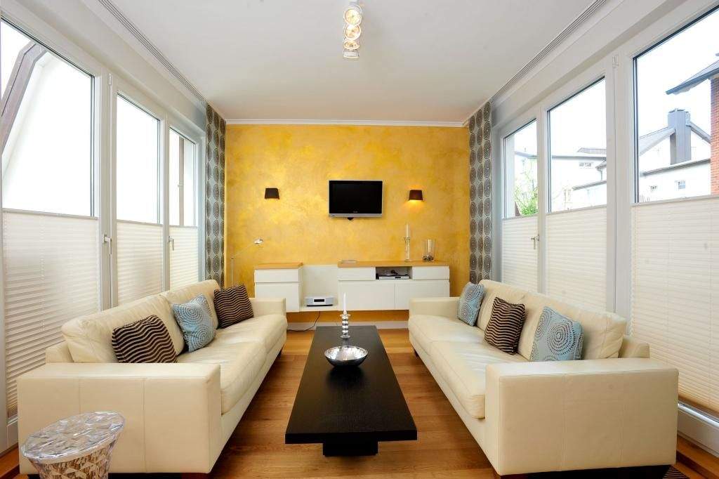 Renovierte Gründerzeitvilla im Bäderstil. Genießen Sie aller höchsten Komfort und die strand- und innenstadtnahe Lage in Westerland auf Sylt. Fußgängerzone Friedrichstraße in direkter Nähe. Nichtraucherwohnung. Haustiere willkommen. Wohnzimmer mit 2 großen Sofas, modernem TV und direktem Zugang zum Balkon nach Süden.