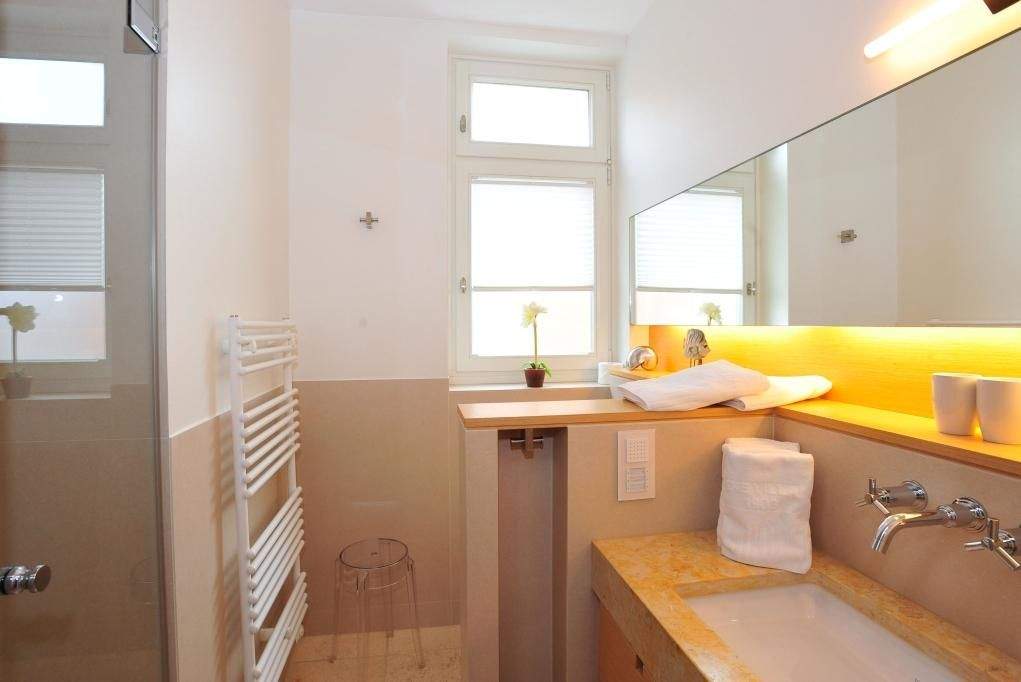 2. Badezimmer mit Dusche, WC, Handtuchwärmer und Tageslicht. Natursteinfußboden.