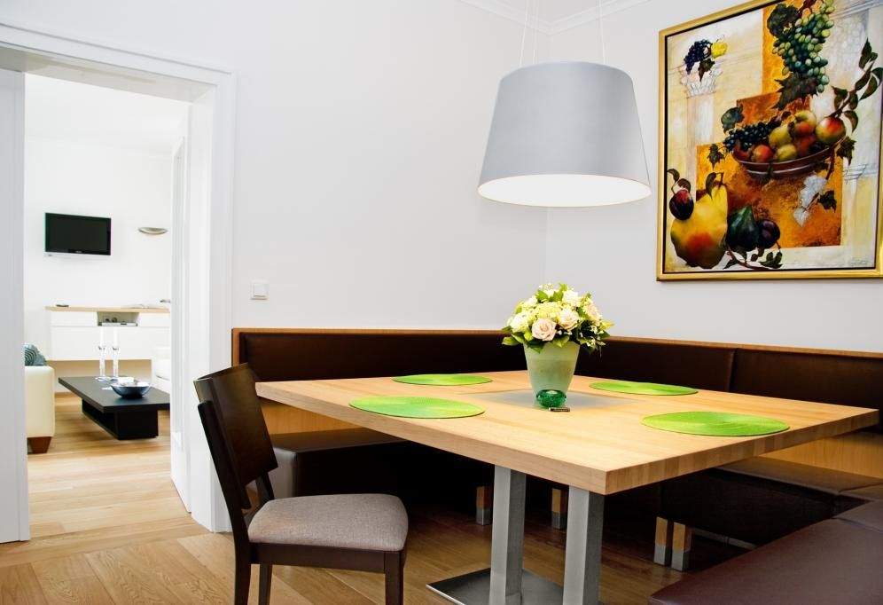 Separate Küche mit Filterkaffeemaschine und allem Komfort. Esszimmer mit sehr großem Esstisch mit gepolsterter Sitzbank.