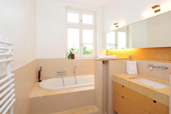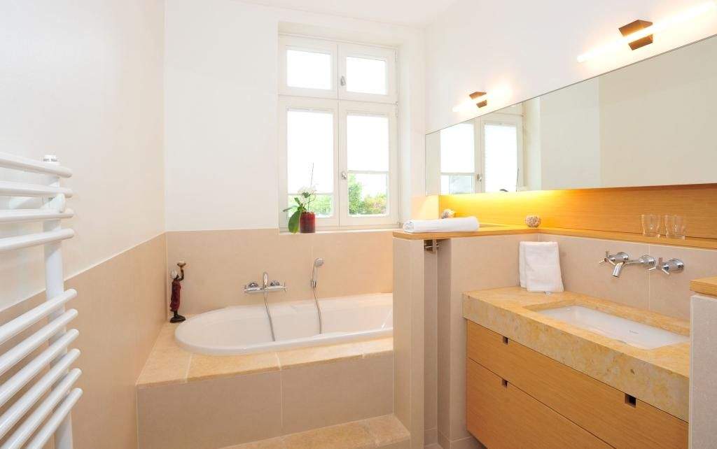 1. Badezimmer mit Badewanne, WC, Handtuchwärmer und Tageslicht. Natursteinfußboden.