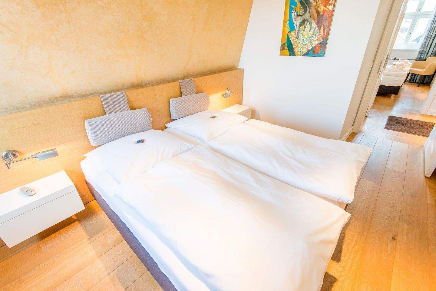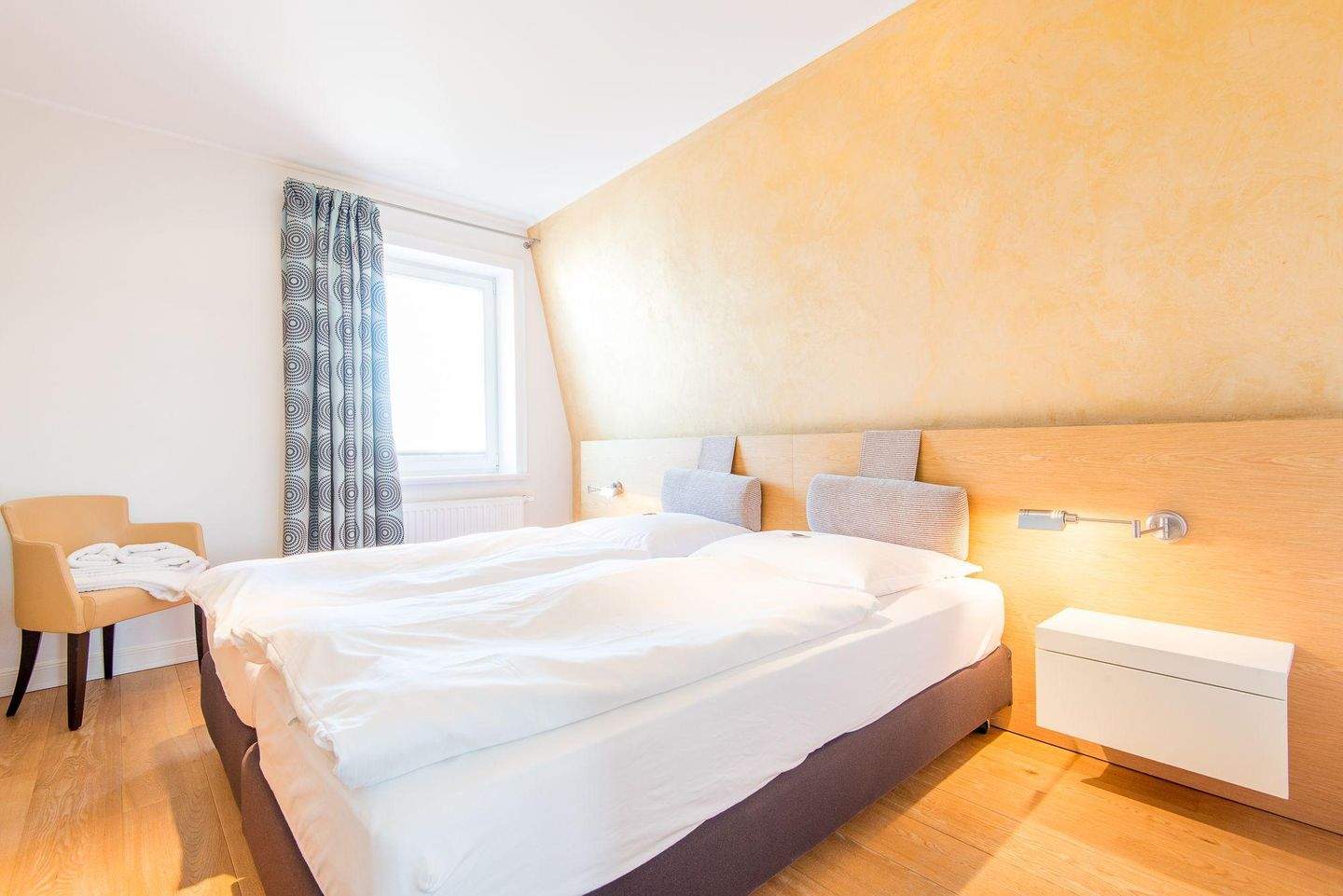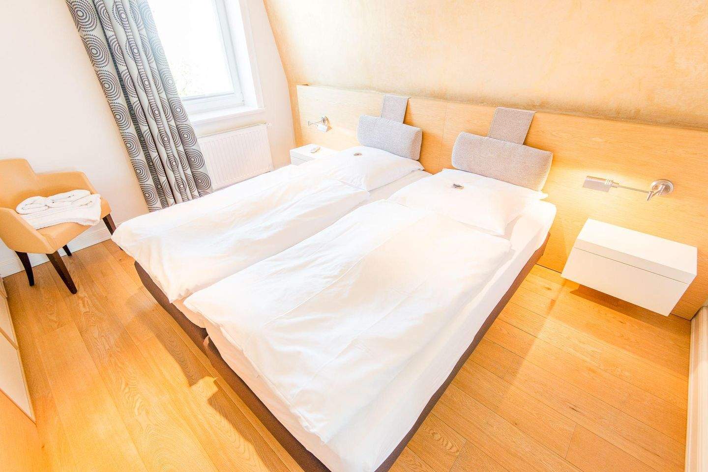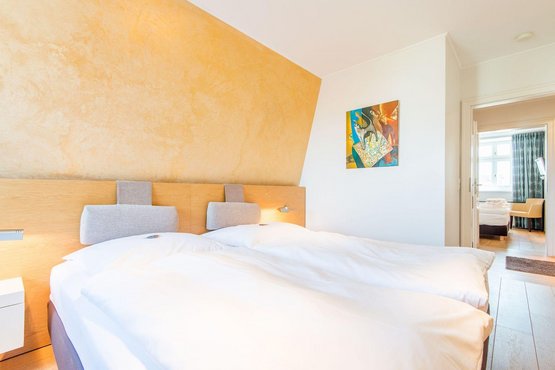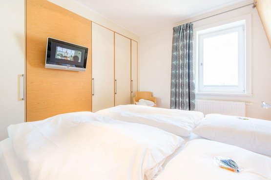 1. Schlafzimmer mit Doppelbett (1x 90x200cm, 1x 80x200cm), TV und Einbauschrank.