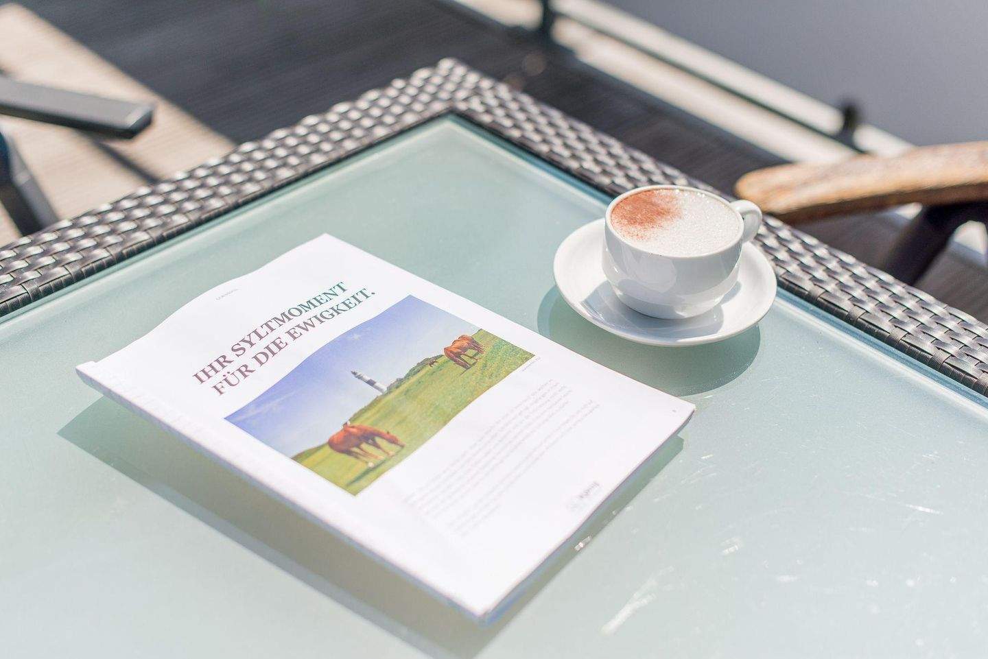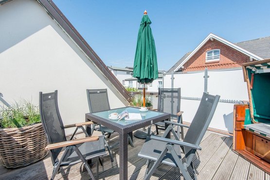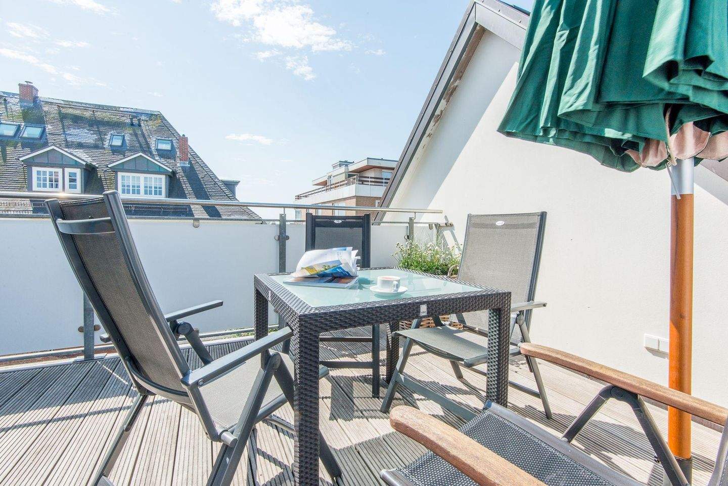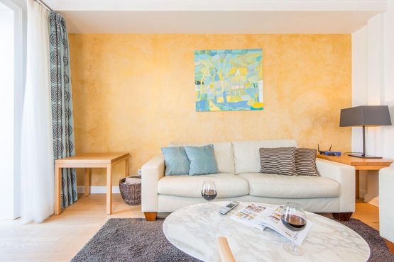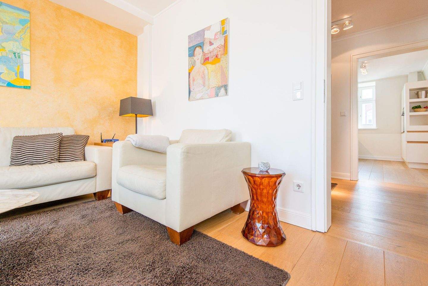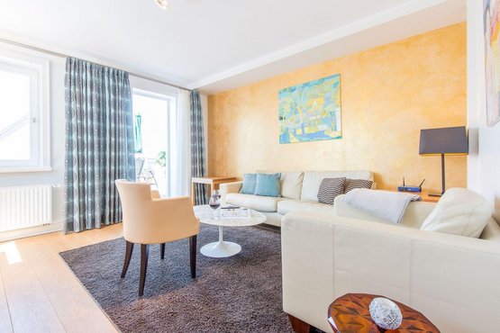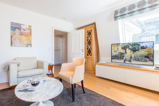 Renovierte Gründerzeitvilla im Bäderstil. Genießen Sie aller höchsten Komfort und die strand- und innenstadtnahe Lage in Westerland auf Sylt. Fußgängerzone Friedrichstraße in direkter Nähe. Nichtraucherwohnung. Haustiere willkommen. Wohnzimmer mit Sofa, Sessel, Vitrine, modernem TV und direktem Zugang zur großen Dachterrasse mit Strandkorb.