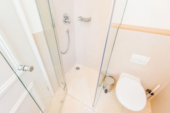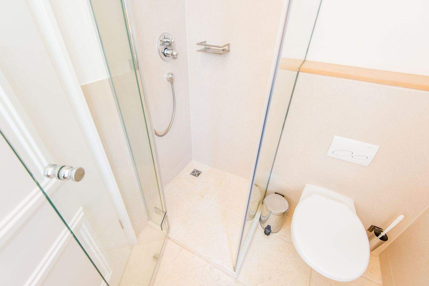 2. Badezimmer mit Dusche, WC, Handtuchwärmer und Tageslicht. Natursteinfußboden.