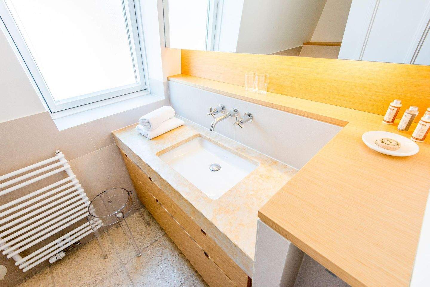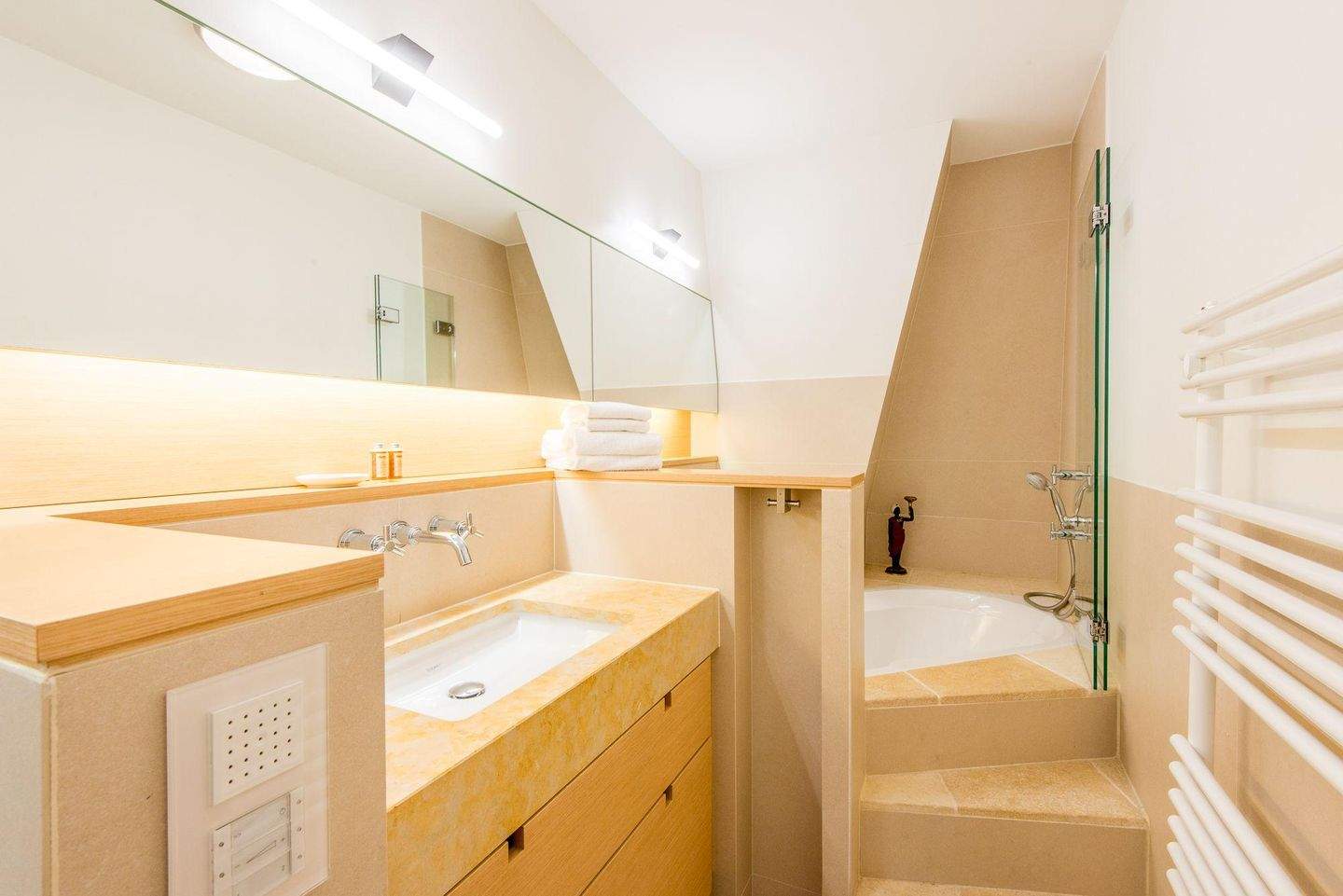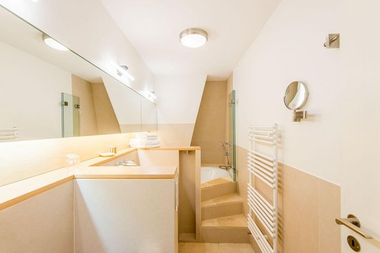 1. Badezimmer mit Badewanne, Dusche, WC und Handtuchwärmer. Natursteinfußboden.