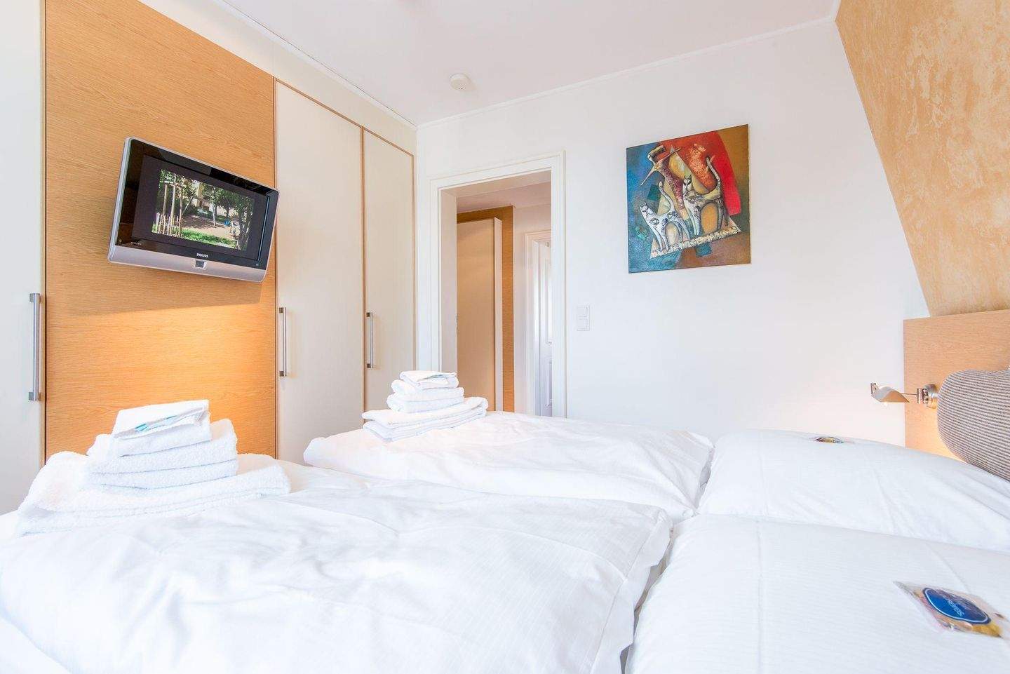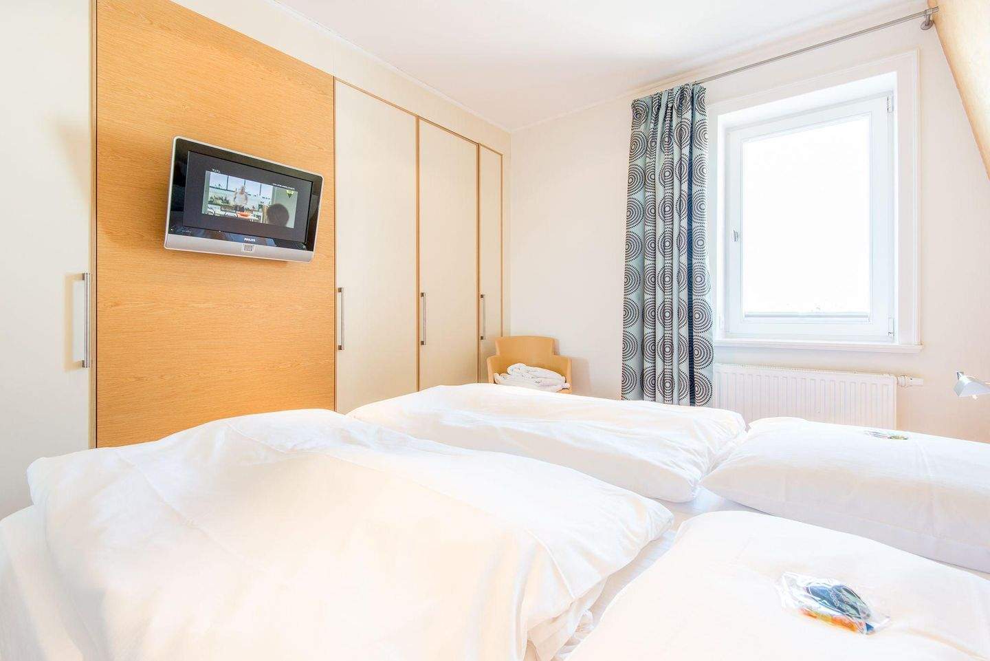 2. Schlafzimmer mit Doppelbett (1x 90x200cm, 1x 80x200cm), TV und Einbauschrank.