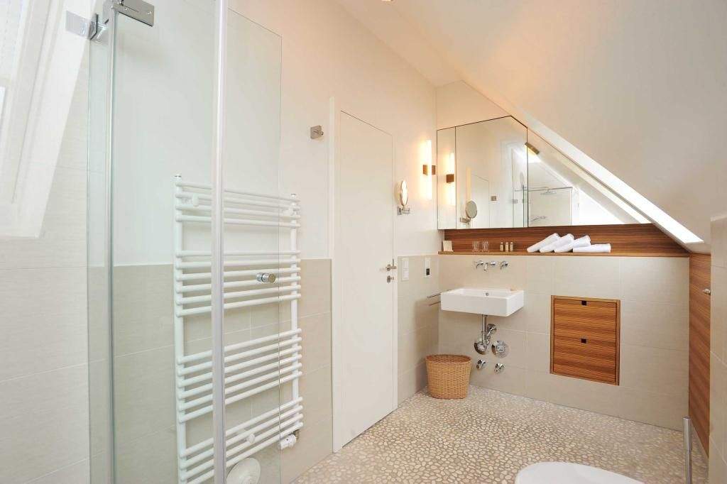 Badezimmer mit Dusche, WC, Handtuchwärmer und Tageslicht. Natursteinfußboden.
