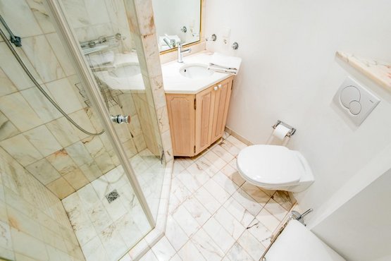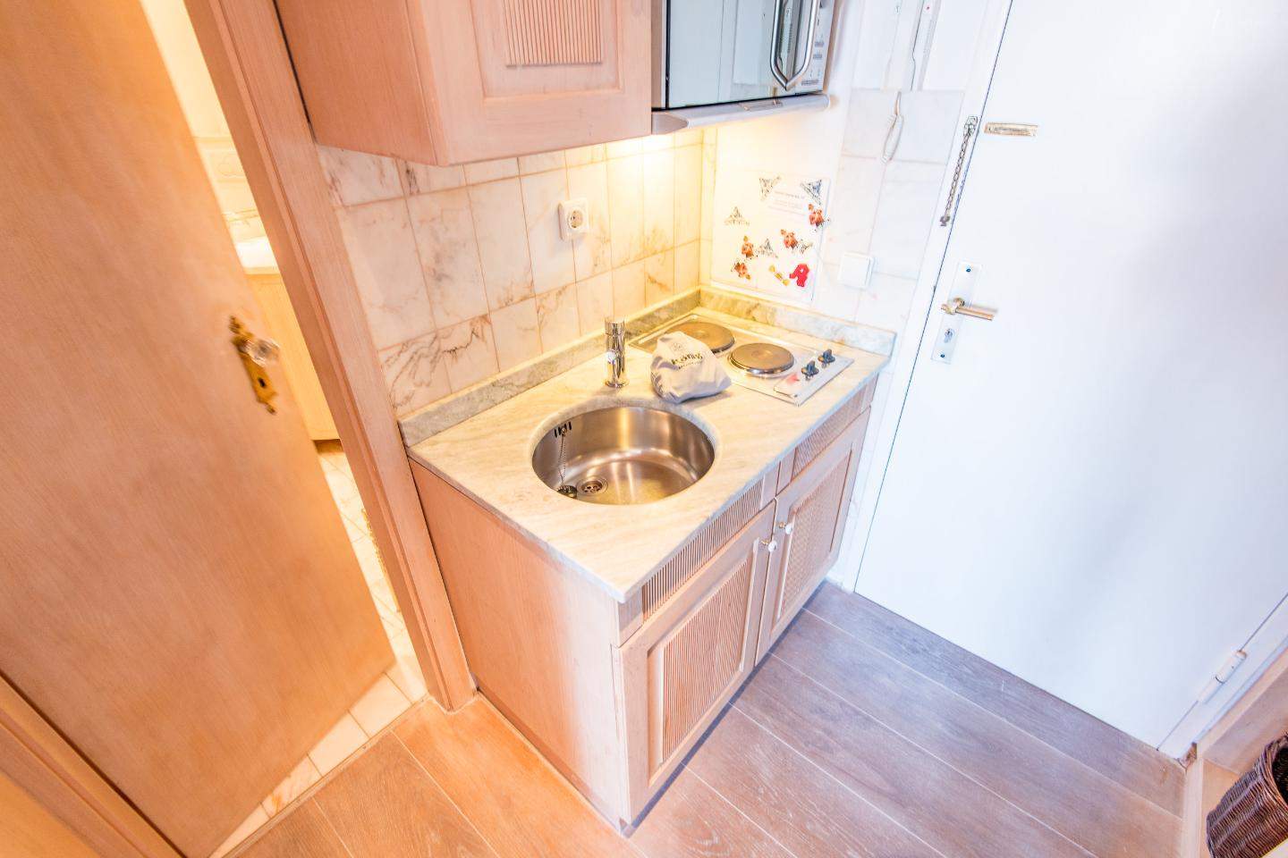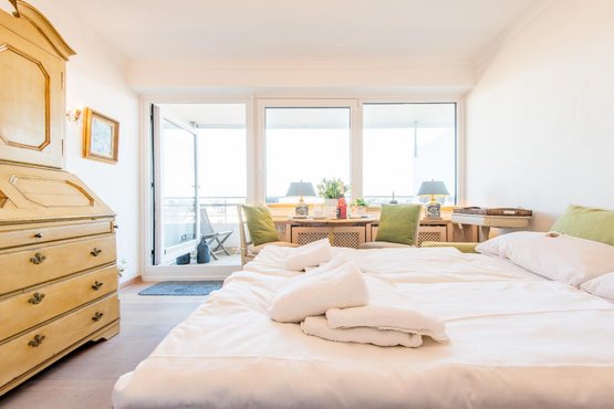 Wohn- und Schlafbereich mit Schlafsofa (160x200) und TV. Gemütliche Essecke mit zwei Stühlen. Direkter Zugang zum möblierten Balkon nach Osten. Offene Einbauküche mit dem üblichen Komfort.