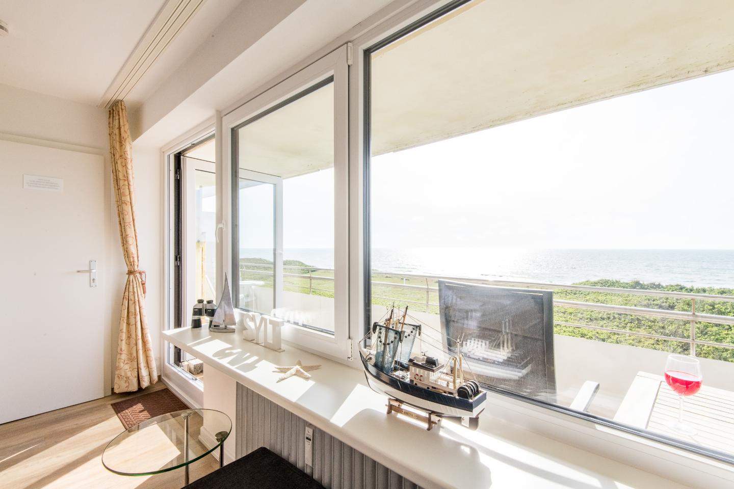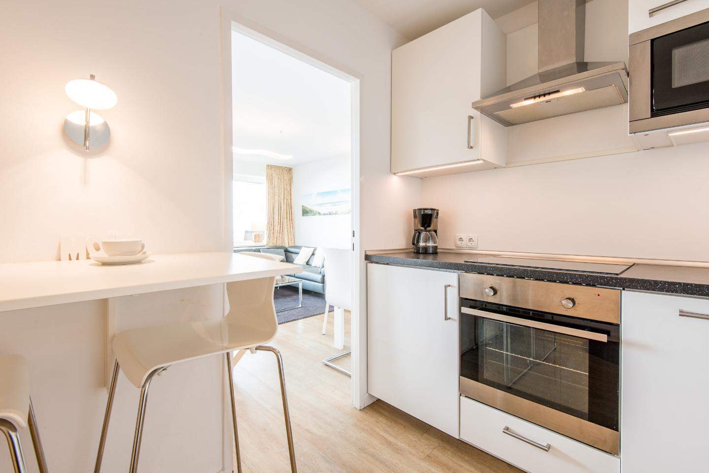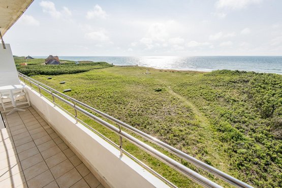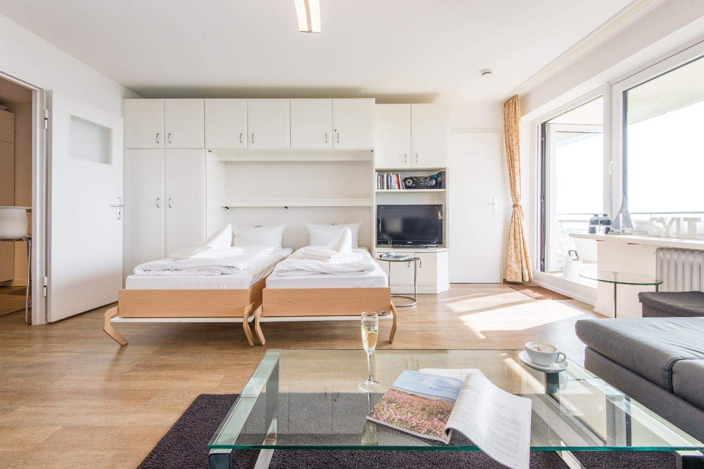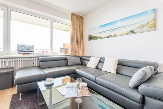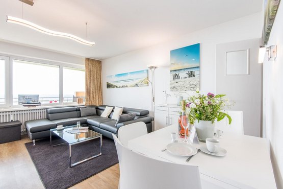 Wohn- und Schlafraum mit Schrankbett (160x200) Hochwertige Sitzgruppe mit TV. Gemütlicher Essbereich mit zwei Sitzplätzen. Direkter Zugang zum möblierten Westbalkon mit tollem Panoramablick über die Dünen und das Meer. Separate Einbauküche mit dem üblichen Komfort.