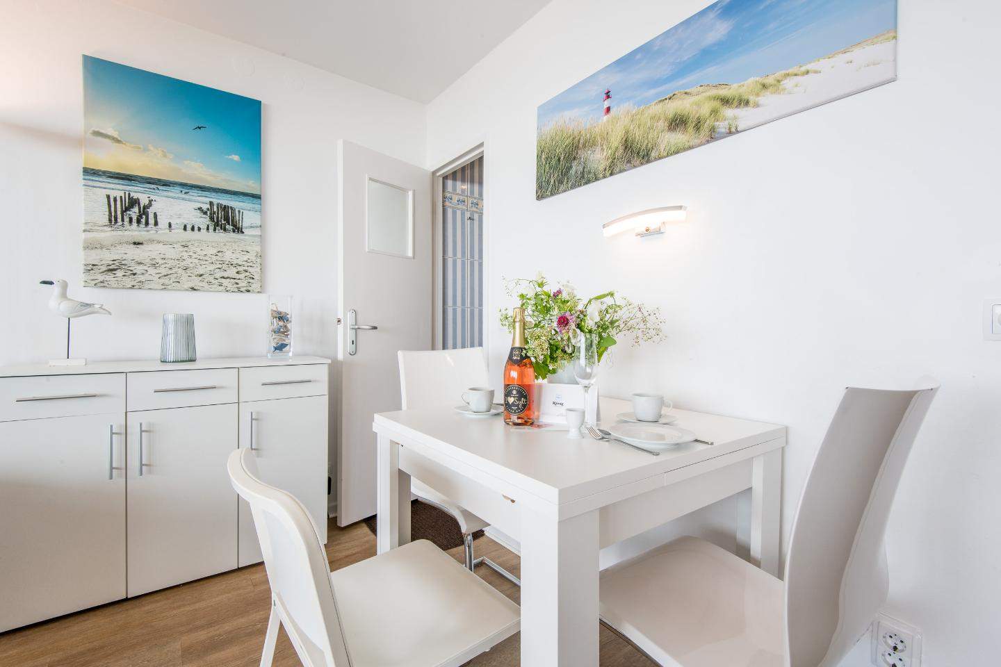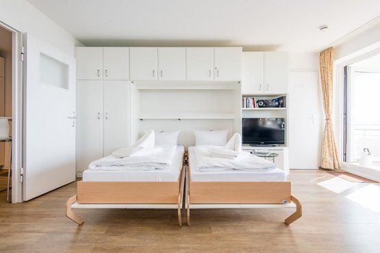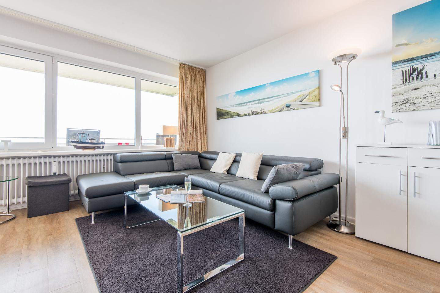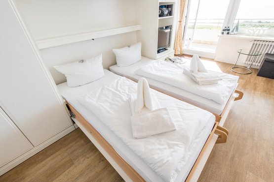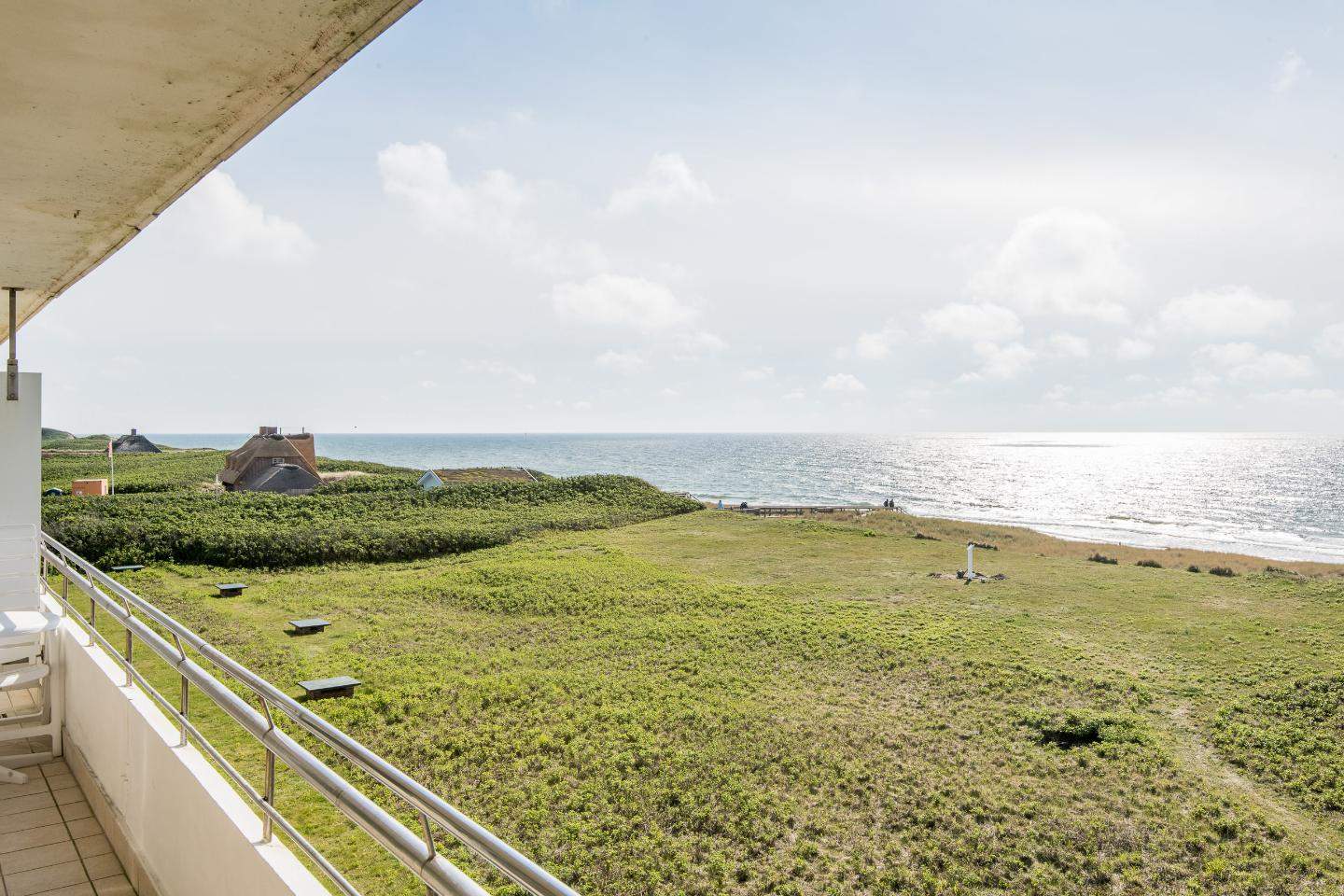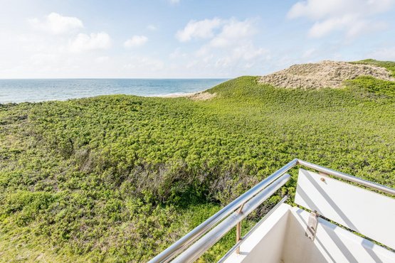 Wohn- und Schlafraum mit Schrankbett (160x200) Hochwertige Sitzgruppe mit TV. Gemütlicher Essbereich mit zwei Sitzplätzen. Direkter Zugang zum möblierten Westbalkon mit tollem Panoramablick über die Dünen und das Meer. Separate Einbauküche mit dem üblichen Komfort.