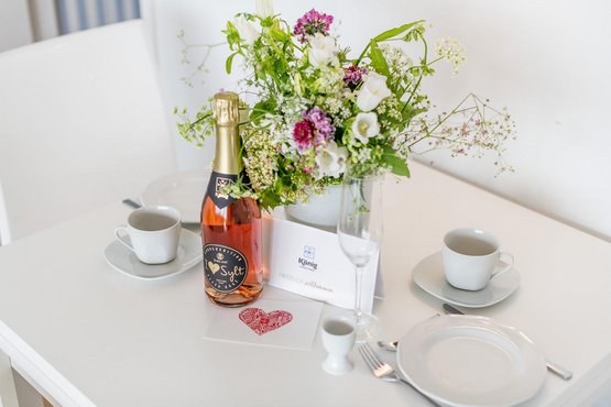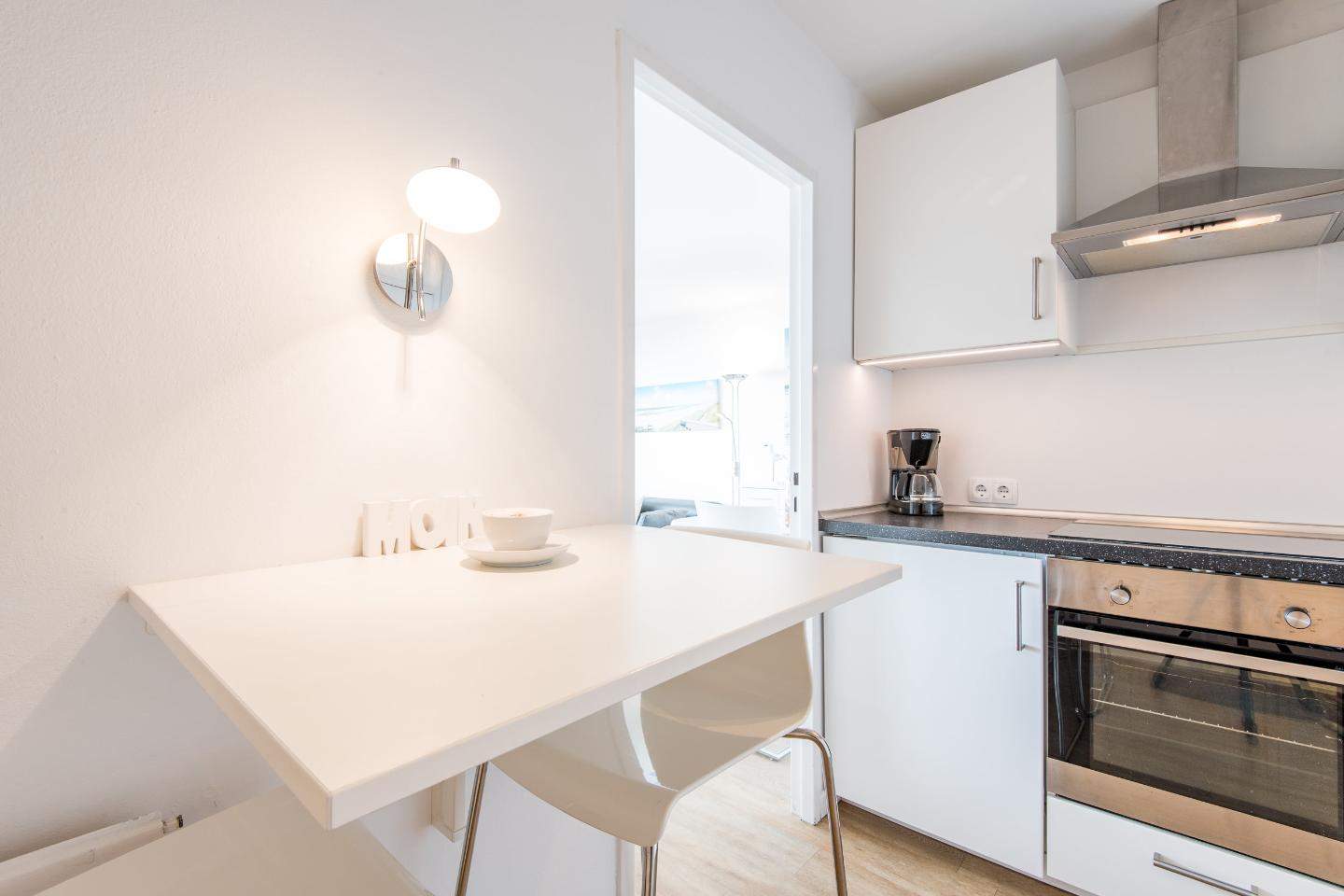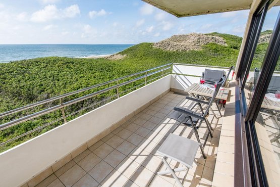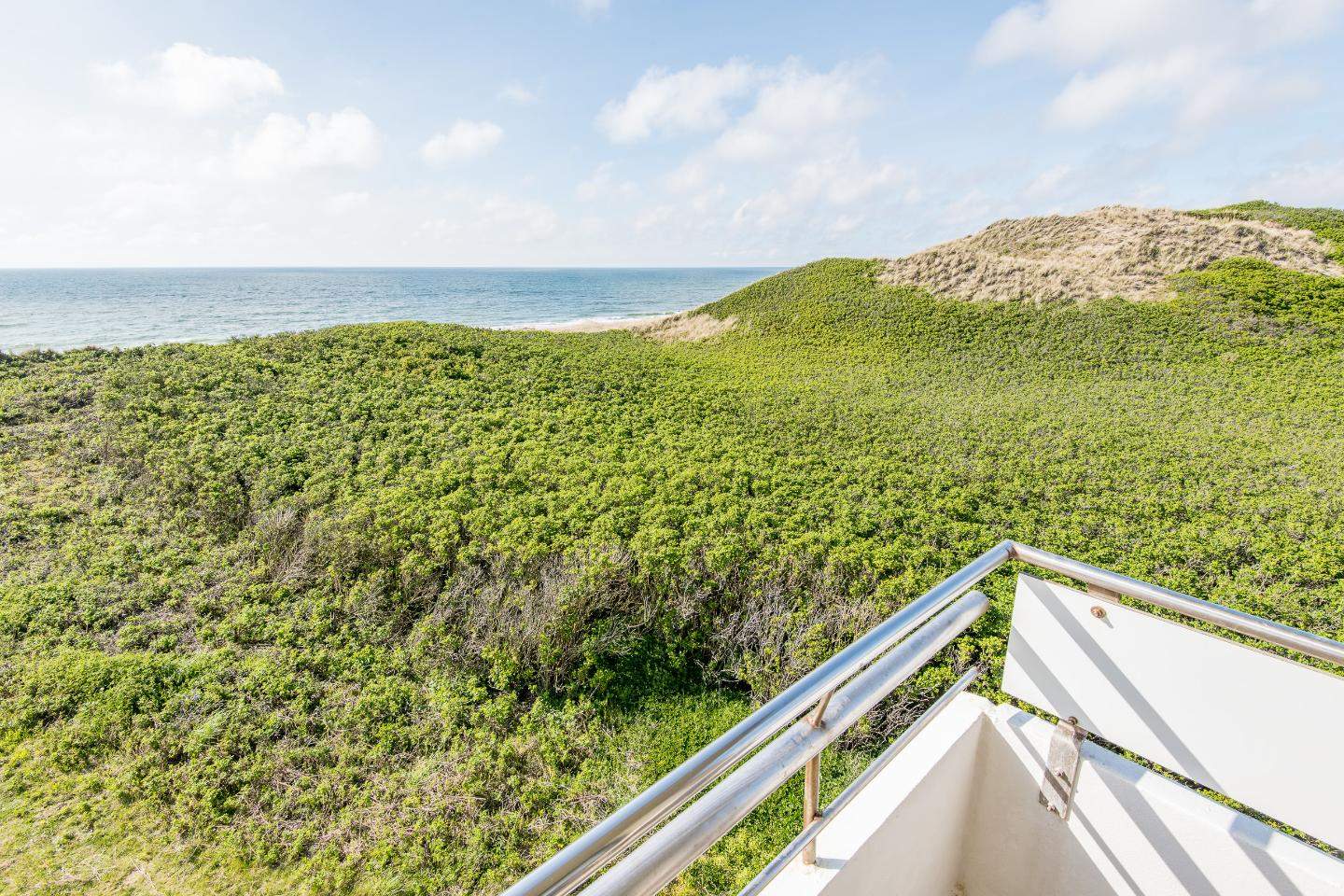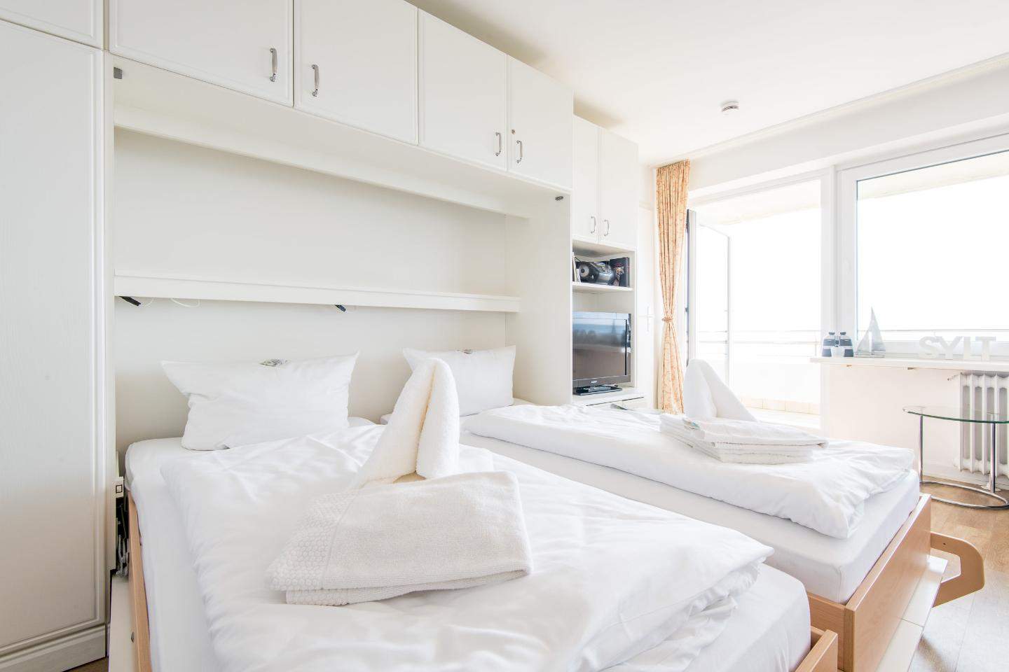 Wohn- und Schlafraum mit Schrankbett (160x200) Hochwertige Sitzgruppe mit TV. Gemütlicher Essbereich mit zwei Sitzplätzen. Direkter Zugang zum möblierten Westbalkon mit tollem Panoramablick über die Dünen und das Meer. Separate Einbauküche mit dem üblichen Komfort.