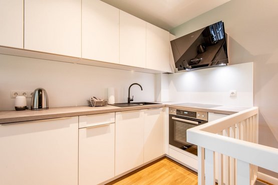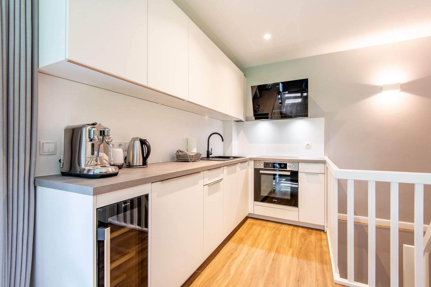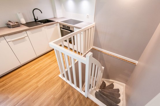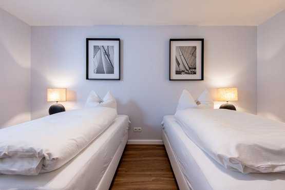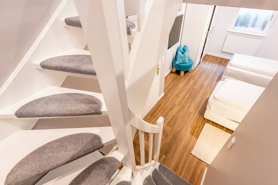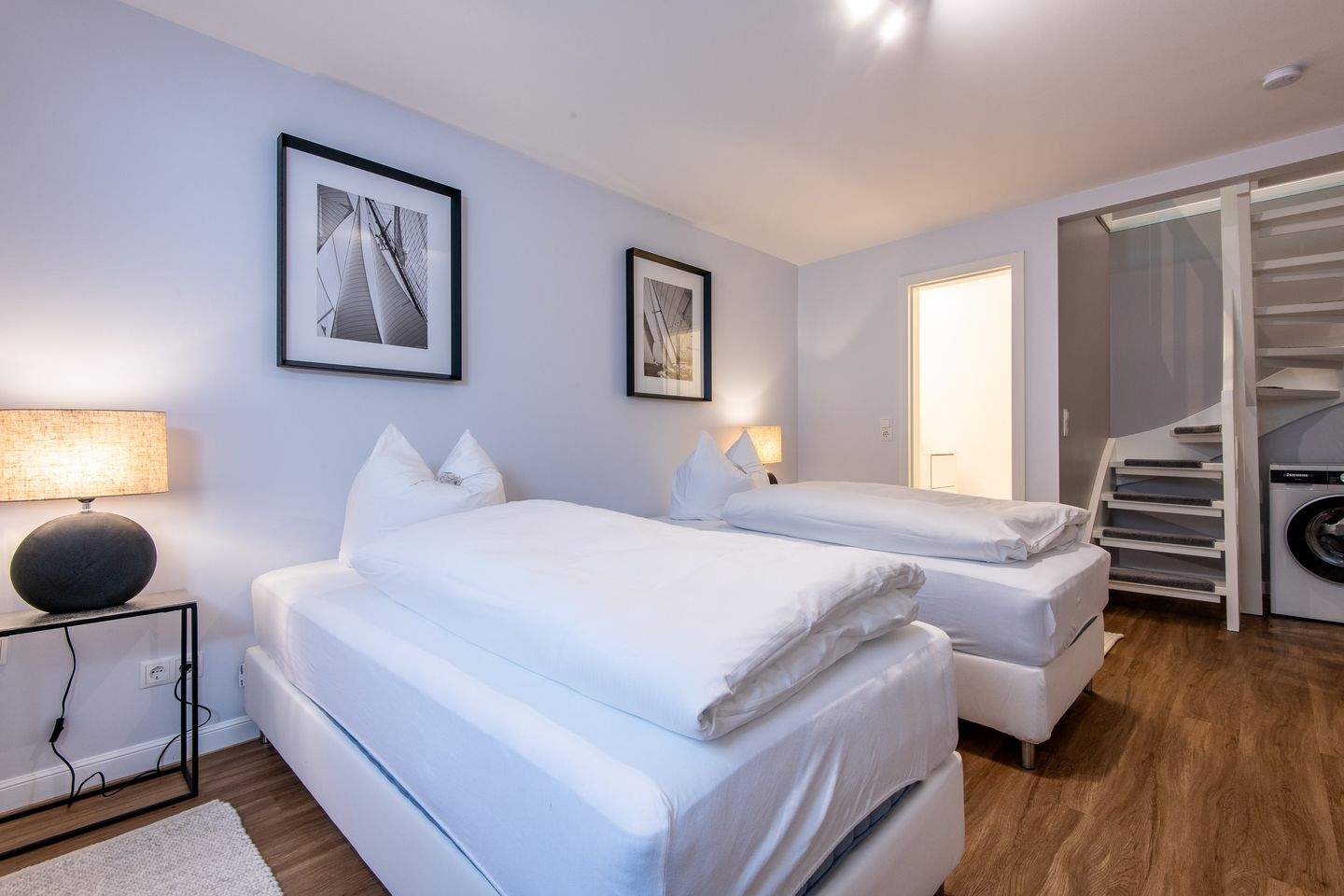 Die untere Etage der Wohnung bietet ein zweites Schlafzimmer, das mit zwei getrennten Betten ausgestattet ist. Bei Bedarf können die Betten auch zu einem großen Bett zusammengestellt werden, um eine flexible Schlafanordnung zu ermöglichen. Ein weiterer Pluspunkt ist der Waschtrockner im Untergeschoss, der Ihnen die Möglichkeit bietet, Ihre Kleidung bequem zu waschen und zu trocknen. Darüber hinaus steht Ihnen ein praktisches Gäste-WC zur Verfügung, um zusätzlichen Komfort zu gewährleisten.