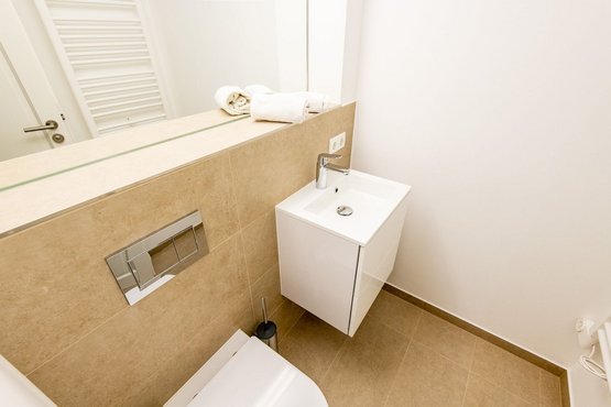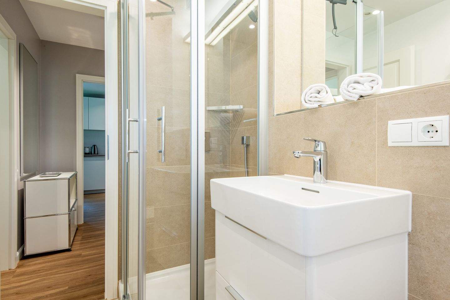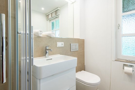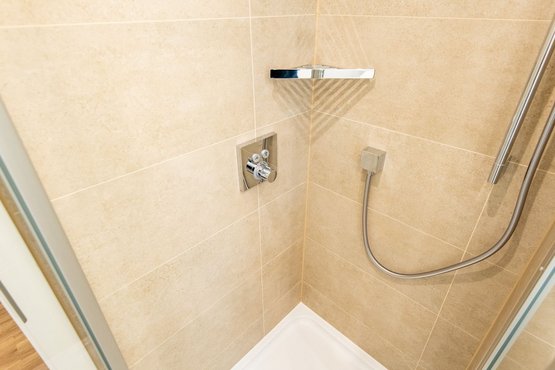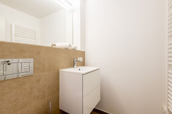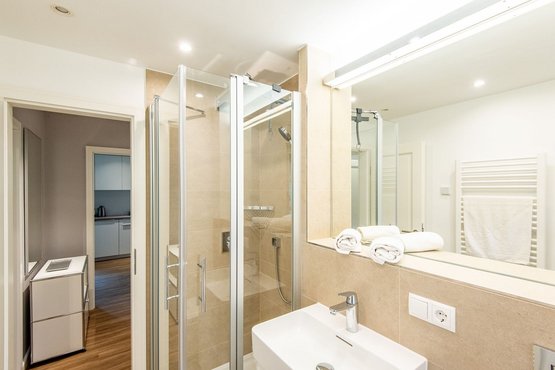 1. Badezimmer mit Dusche, WC und Handtuchwärmer
