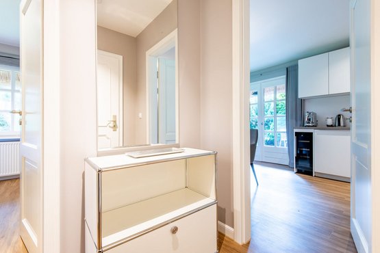 Im Erdgeschoss betreten Sie die Wohnung durch einen kleinen Flur, der mit einer Garderobe ausgestattet ist, um Ihre Jacken und Accessoires ordentlich zu verstauen. Von hier aus gelangen Sie zum Badezimmer, das mit modernen Annehmlichkeiten ausgestattet ist und höchsten Komfort bietet. Daneben befindet sich das geräumige und stilvoll eingerichtete Hauptschlafzimmer, das Ihnen absolute Privatsphäre und Entspannung garantiert.