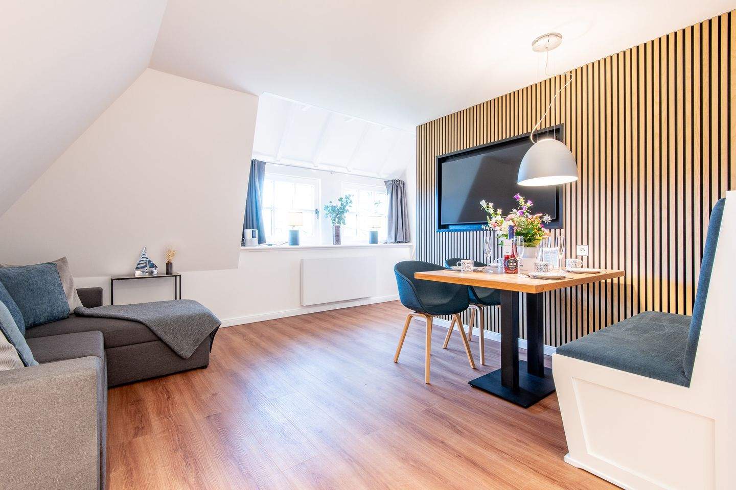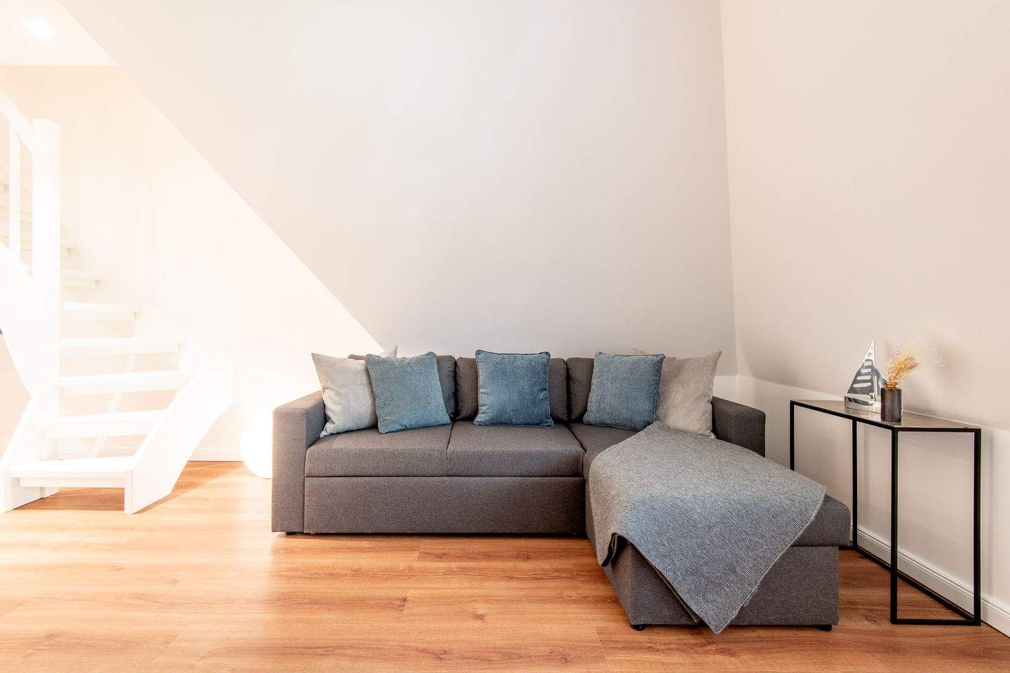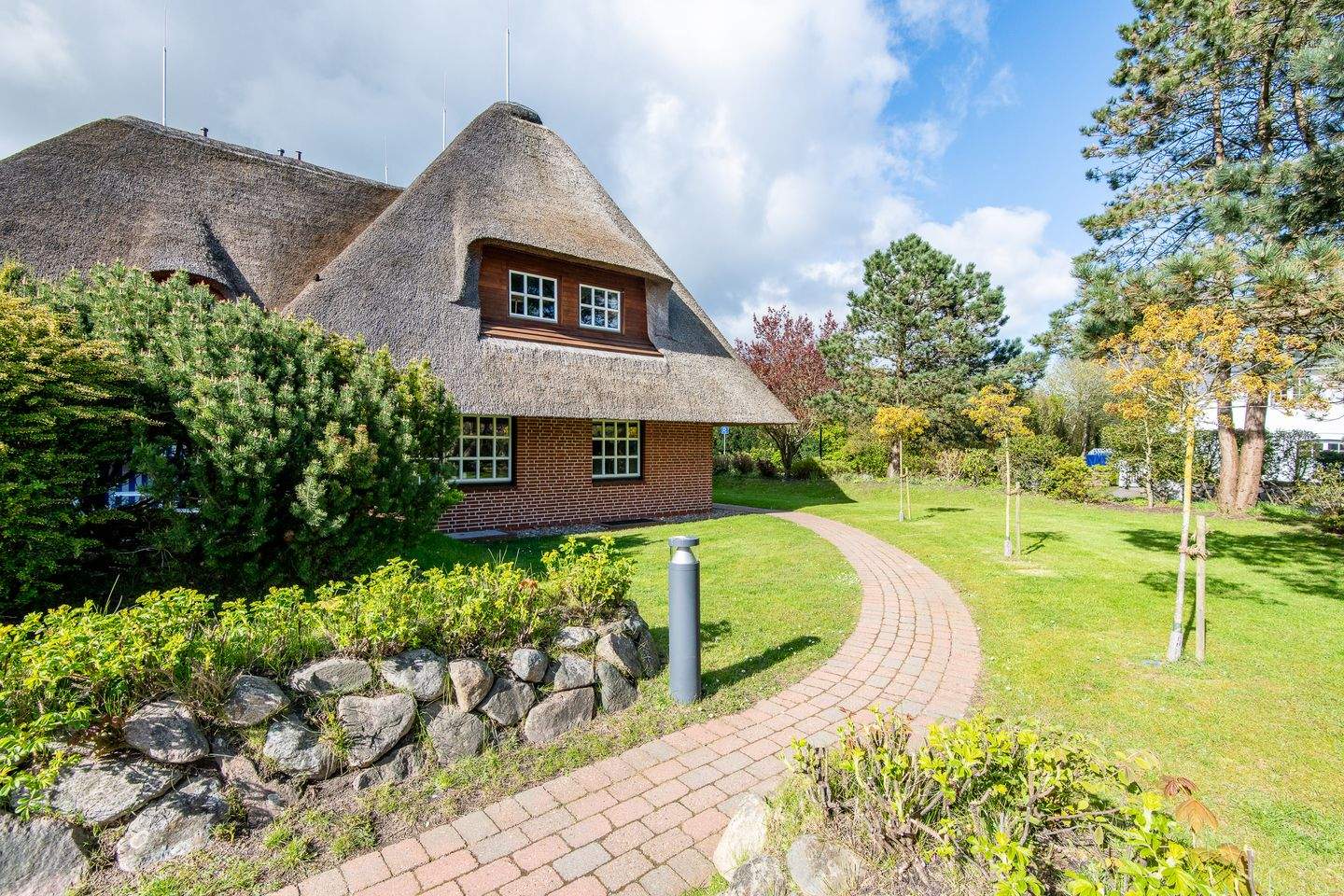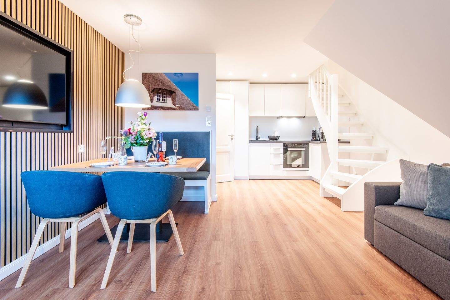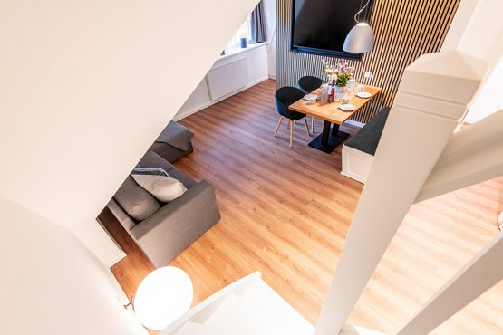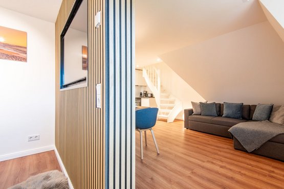 Kernsanierte Maisonette-Ferienwohnung unter Reet, die sich über zwei Ebenen erstreckt und eine Gesamtfläche von ca. 59 qm bietet. Die Wohnung ist ideal für bis zu 4 Personen und bietet einen charmanten Rückzugsort für Ihren erholsamen Urlaub.