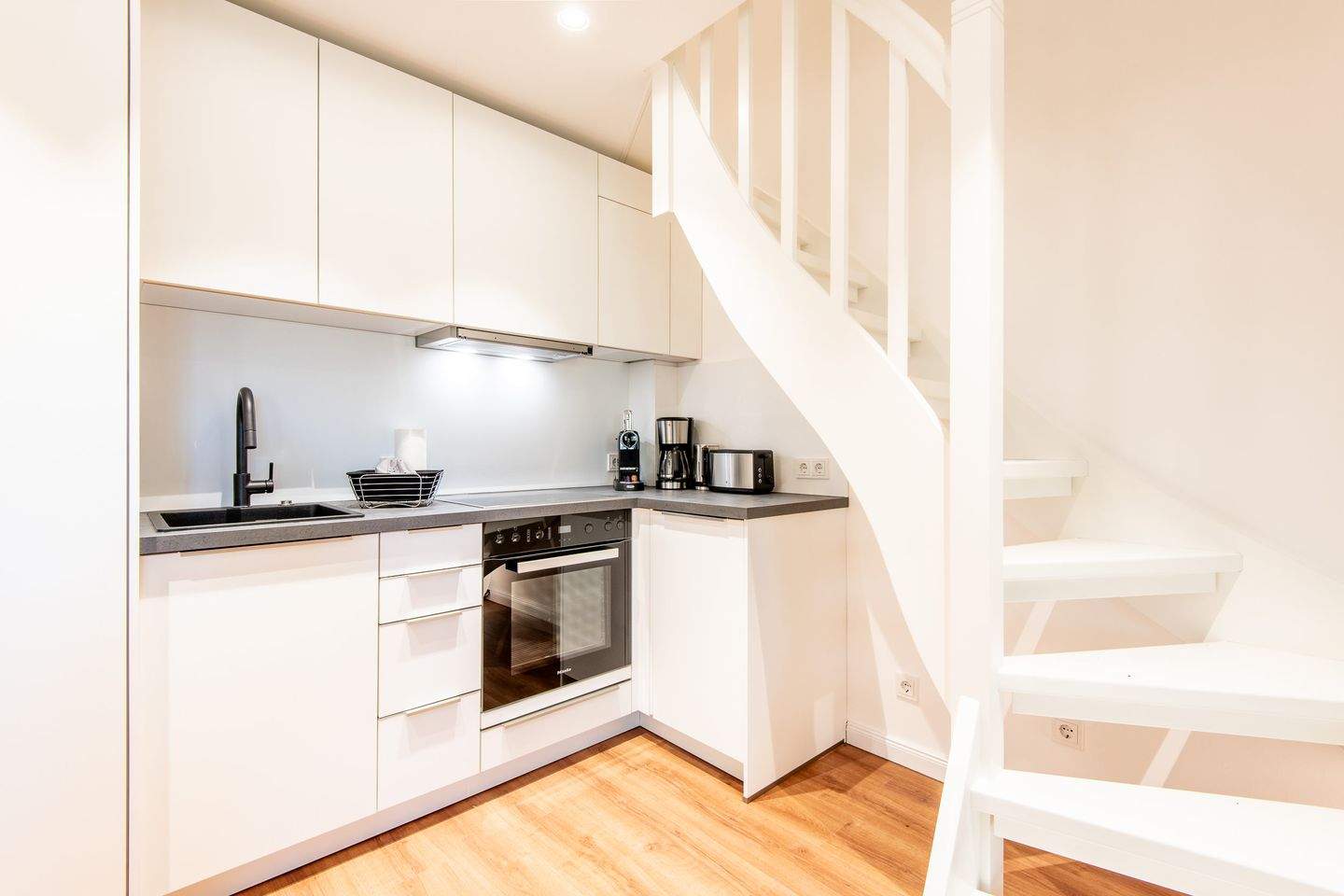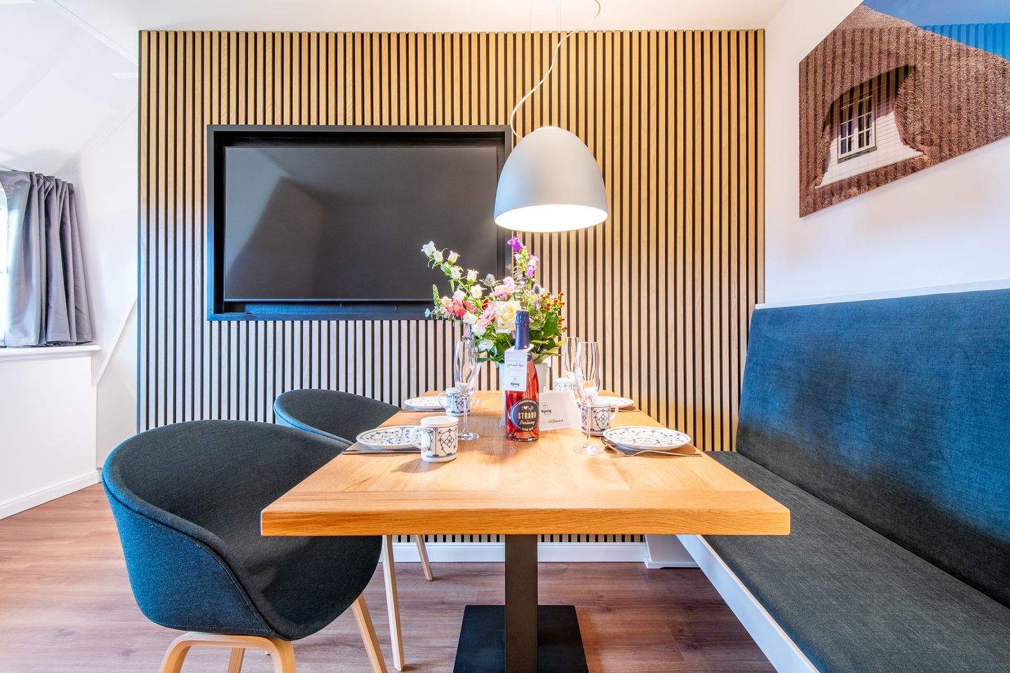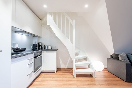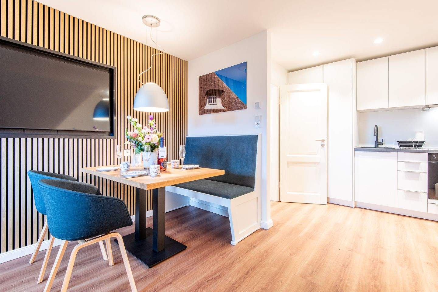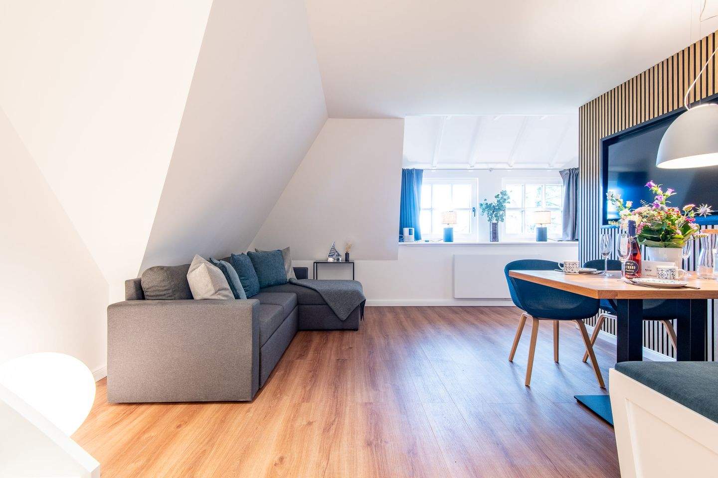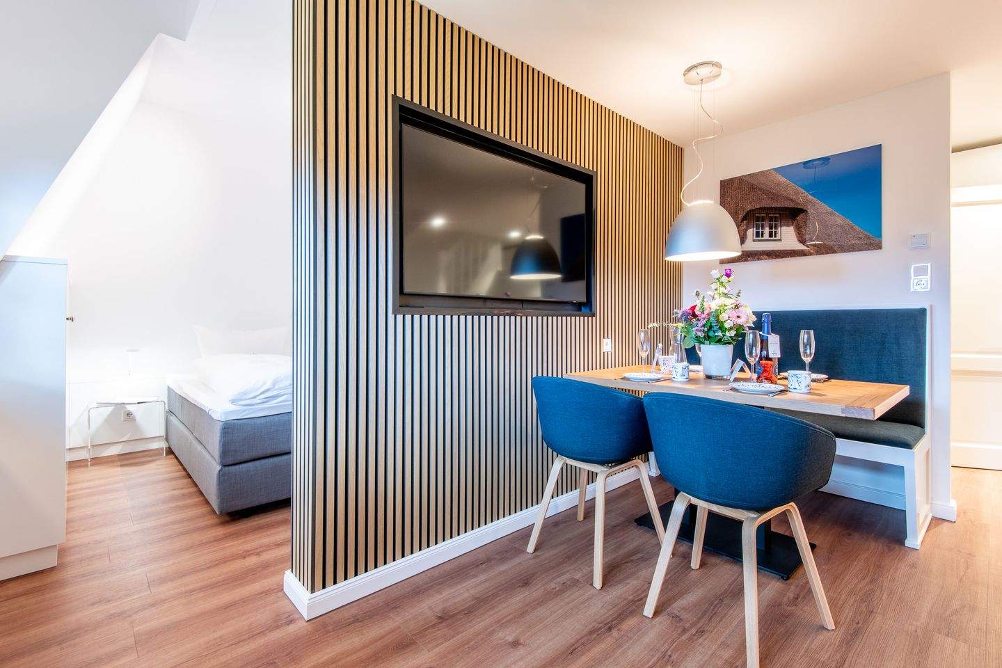 Kernsanierte Maisonette-Ferienwohnung unter Reet, die sich über zwei Ebenen erstreckt und eine Gesamtfläche von ca. 59 qm bietet. Die Wohnung ist ideal für bis zu 4 Personen und bietet einen charmanten Rückzugsort für Ihren erholsamen Urlaub.
