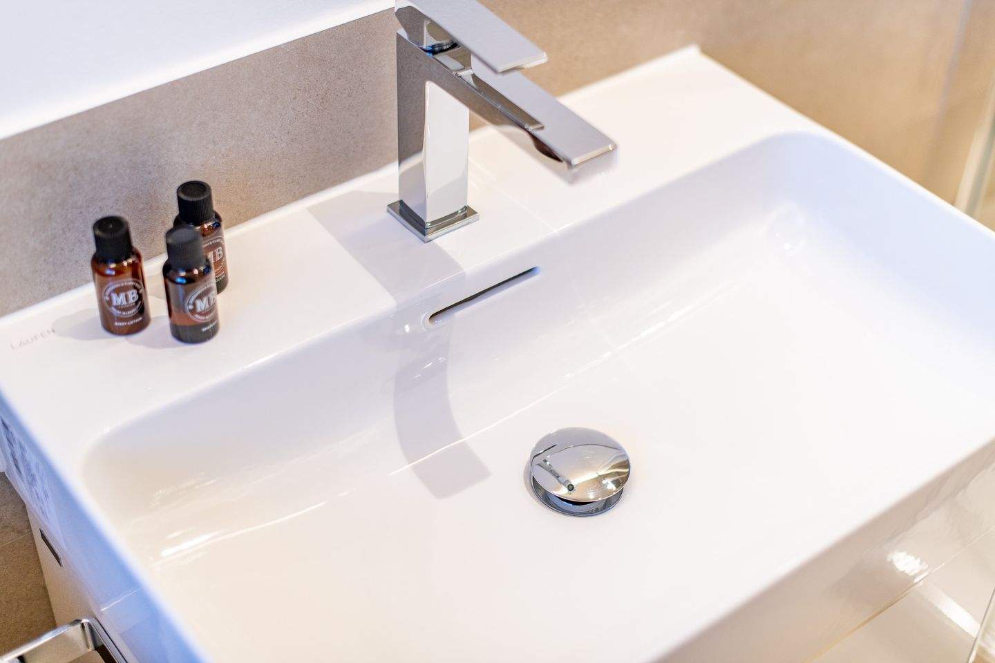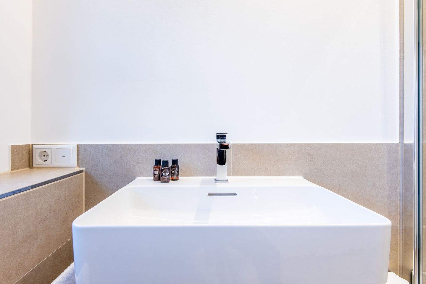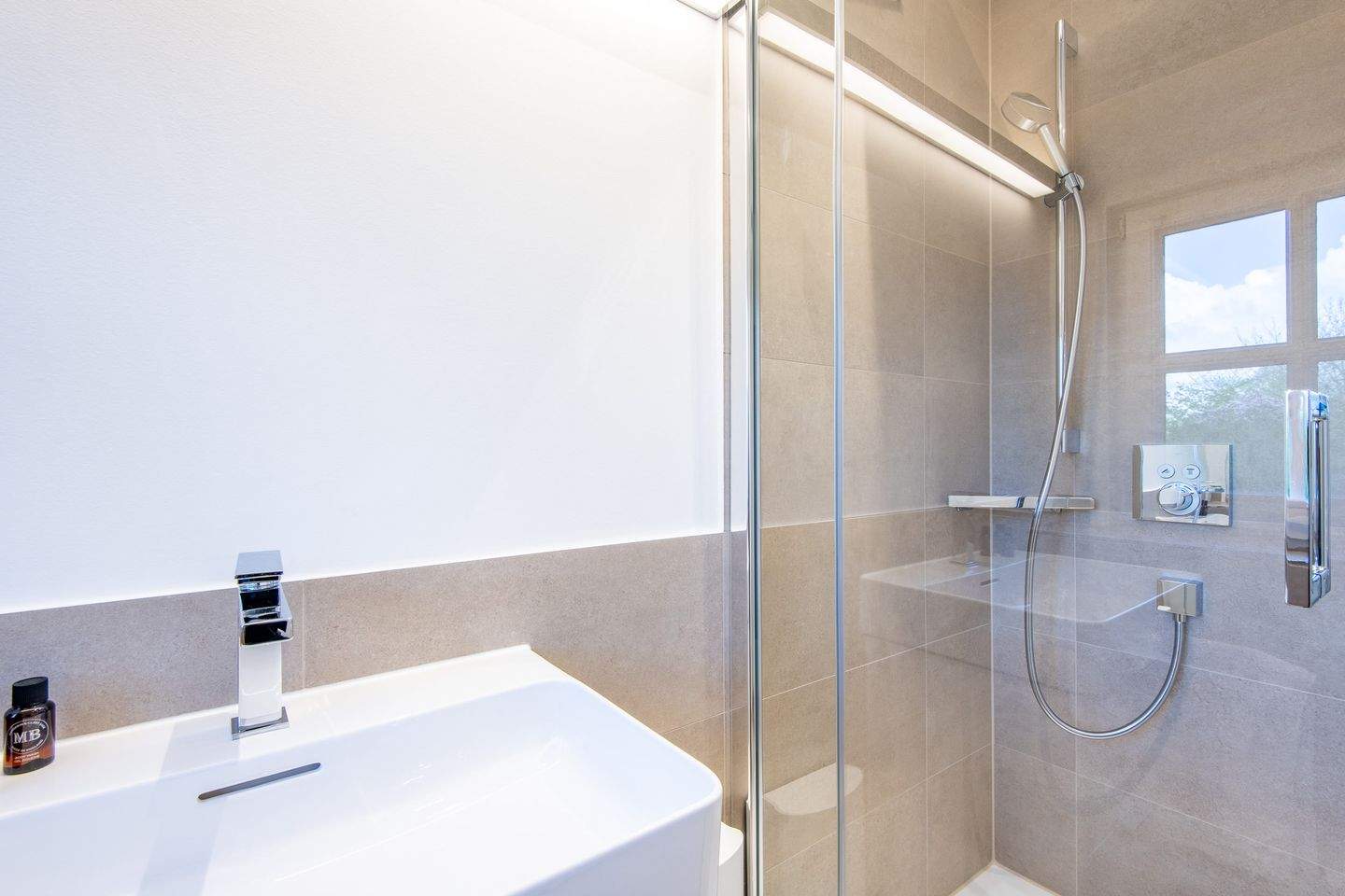 Das Badezimmer mit Tageslicht und ebenerdiger Dusche ist modern ausgestattet.