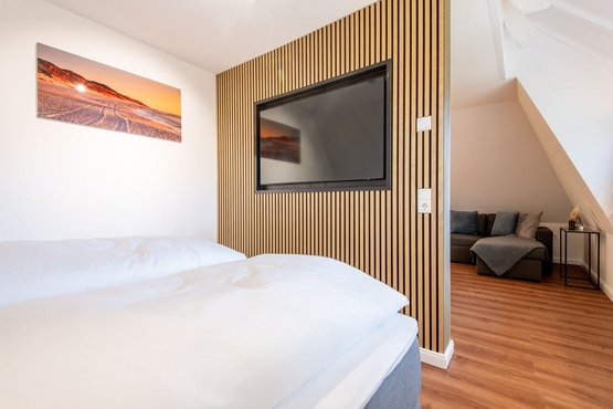 1. Schlafzimmer mit Doppelbett (180x200 cm) mit Kleiderschrank und TV.