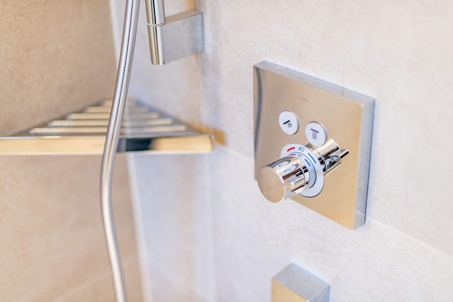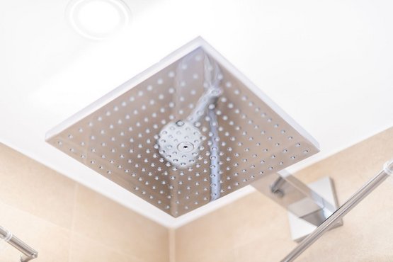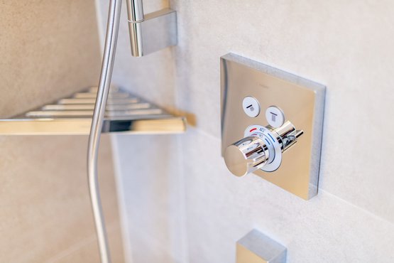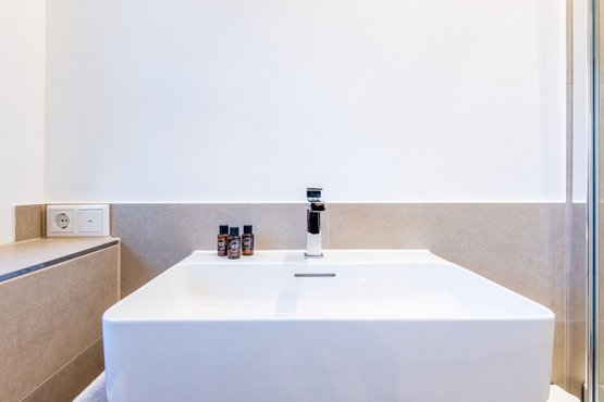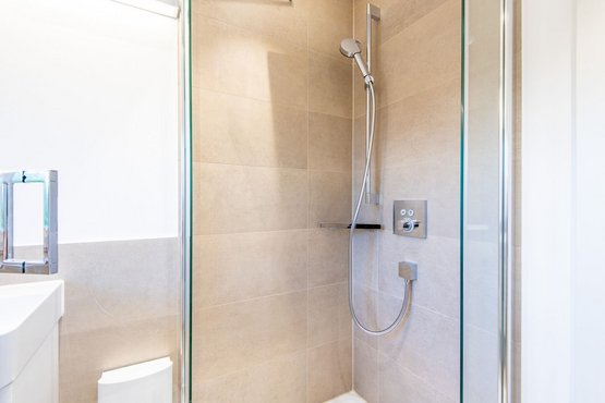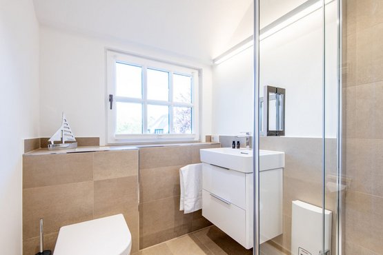 1. Badezimmer mit Dusche, WC und Handtuchwärmer