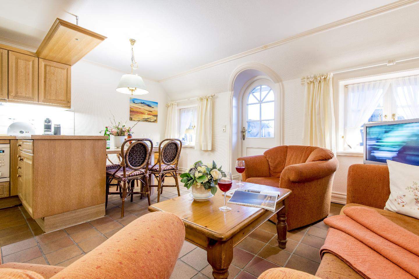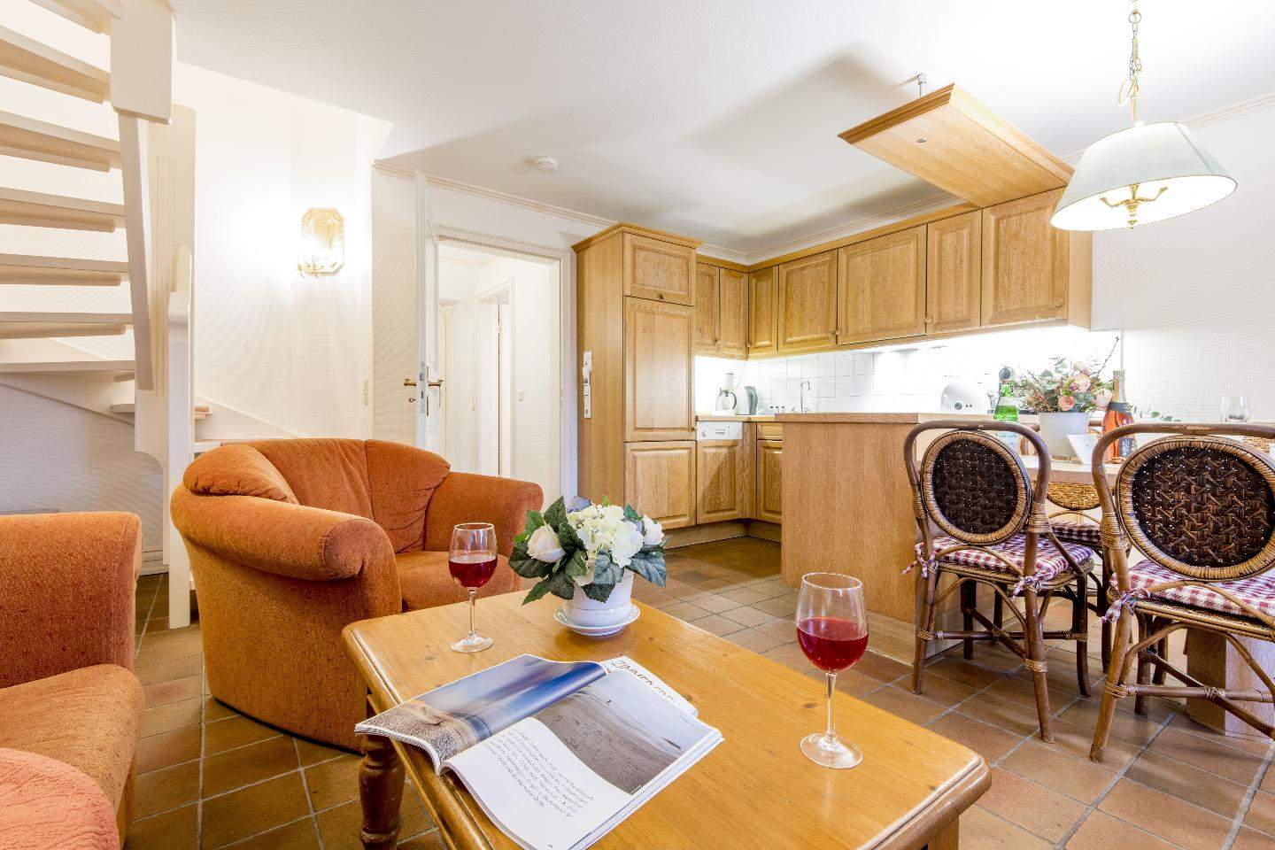 Angesagte Restaurants und Kaffees können Sie in direkter Nähe genießen. Die sonnige, möblierte Terrasse rundet das Angebot ab. Hunde sind herzlich willkommen. Wohn-Essbereich mit Sofa, Sessel und TV. Direkter Zugang zur sonnigen, möblierten Terrasse mit Strandkorb. (April-Oktober)