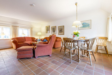 Die möblierte und sonnige Terrasse lädt zu wunderschönen Sonnenstunden zusammen mit der Familie ein. Genießen Sie friesische Gemütlichkeit unter Reet. Hunde sind herzlich willkommen. Wohnzimmer mit Sofa, TV und gemütlicher Essecke. Direkter Zugang zur möblierten Terrasse mit Strandkorb. (April-Oktober). Das gesamte Erdgeschoss verfügt über eine Fußbodenheizung sowie alten Pluviosen.