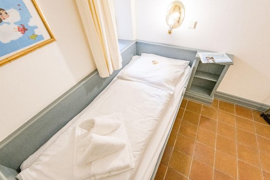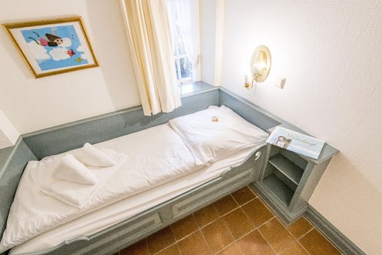 2. Schlafzimmer mit Einzelbett (90x200cm) mit Tischlereinbauten.