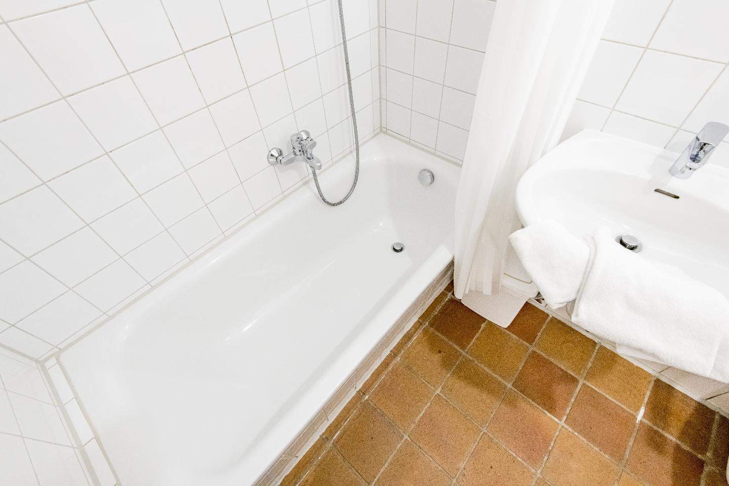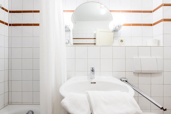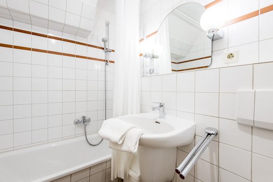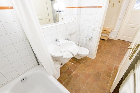 1. Badezimmer mit Badewanne, Dusche, WC, Waschtisch, Handtuchtrockner und Fön.