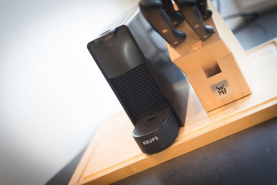 Offene Tischlerküche mit allem modernem Komfort wie Induktions-Kochfeld, Backofen, Mikrowelle, Nespresso und Filterkaffeemaschine.