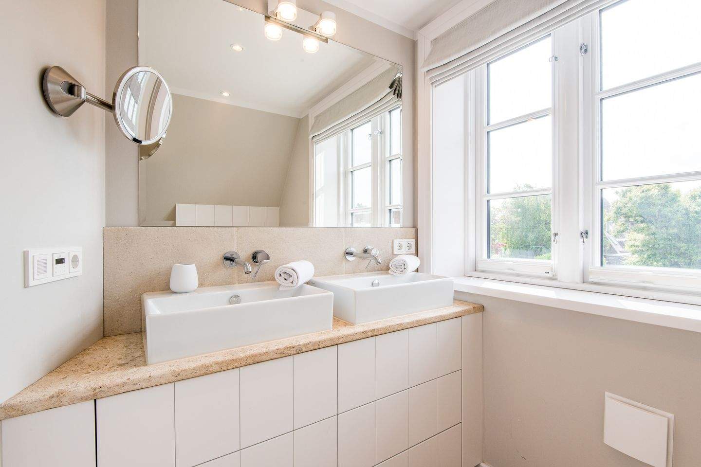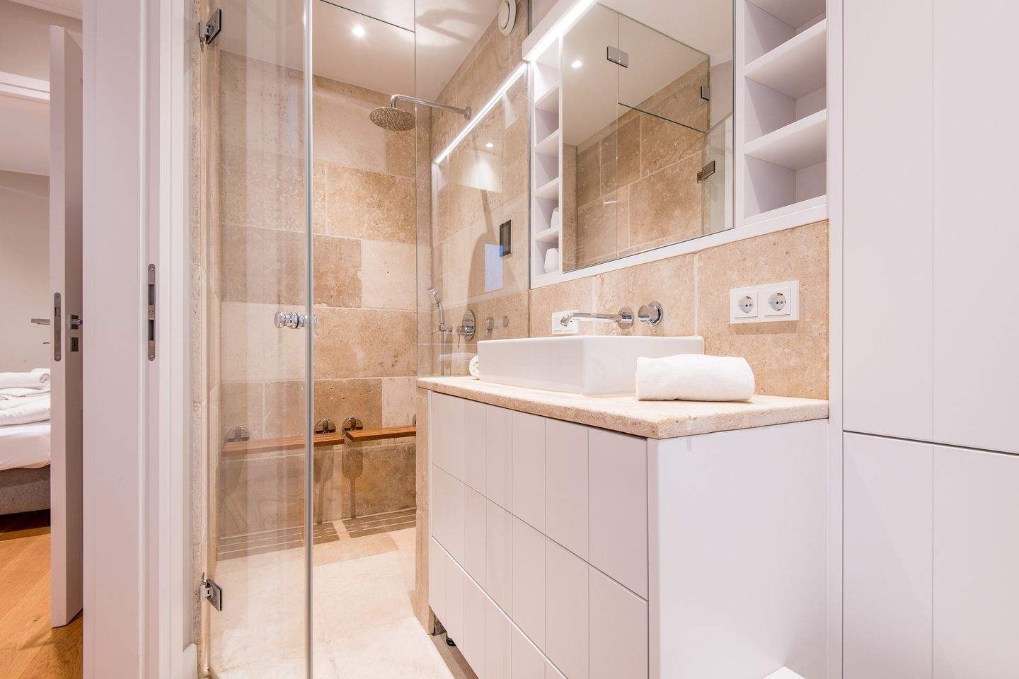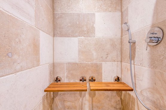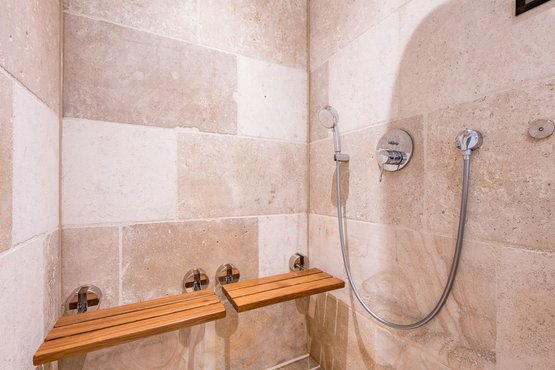 1. Badezimmer (Duschbad) mit ebenerdiger Regendusche, Handtuchwärmer, Föhn, Waschbecken, separatem WC und moderner Dampfdusche.